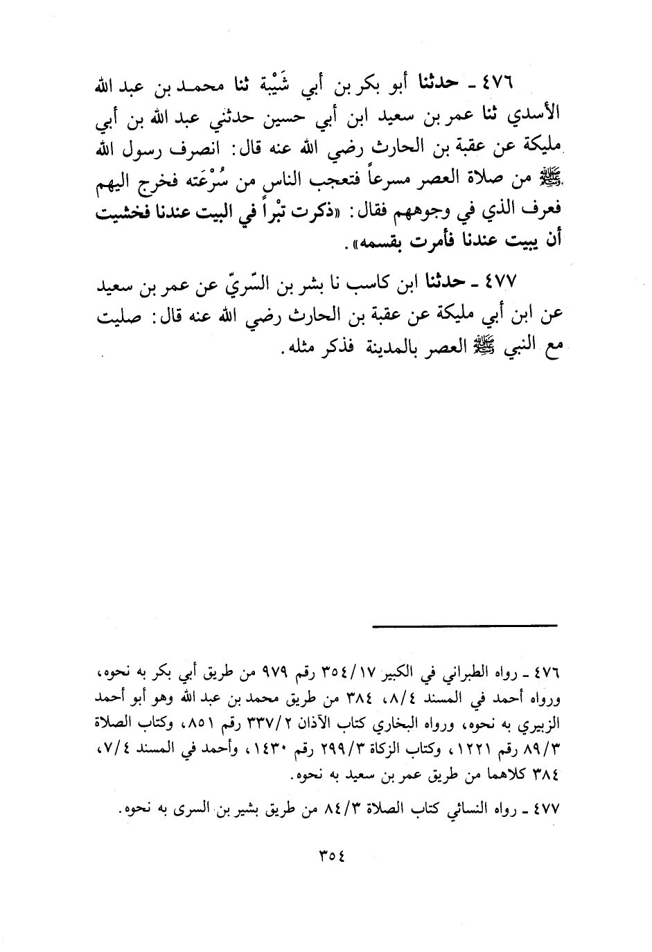 476 - حَدَّثَنَا أَبُو بَكْرِ بْنُ أَبِي شَيْبَةَ، ثنا مُحَمَّدُ بْنُ عَبْدِ اللَّهِ الْأَسَدِيُّ، ثنا عُمَرُ بْنُ سَعِيدِ بْنِ أَبِي حُسَيْنٍ، حَدَّثَنِي عَبْدُ اللَّهِ بْنُ أَبِي مُلَيْكَةَ، عَنْ عُقْبَةَ بْنِ الْحَارِثِ رَضِيَ اللَّهُ عَنْهُ، قَالَ: انْصَرَفَ رَسُولُ اللَّهِ صَلَّى اللهُ عَلَيْهِ وَسَلَّمَ، مِنْ صَلَاةِ الْعَصْرِ مُسْرِعًا، فَتَعَجَّبَ النَّاسُ مِنْ سُرْعَتِهِ، فَخَرَج إِلَيْهِمْ فَعَرَفَ الَّذِي فِي وُجُوهِهِمْ، فَقَالَ: «§ذَكَرْتُ تِبْرًا فِي الْبَيْتِ عِنْدَنَا، فَخَشِيتُ أَنْ يَبِيتَ عِنْدَنَا فَأَمَرْتُ بِقَسْمِهِ» .