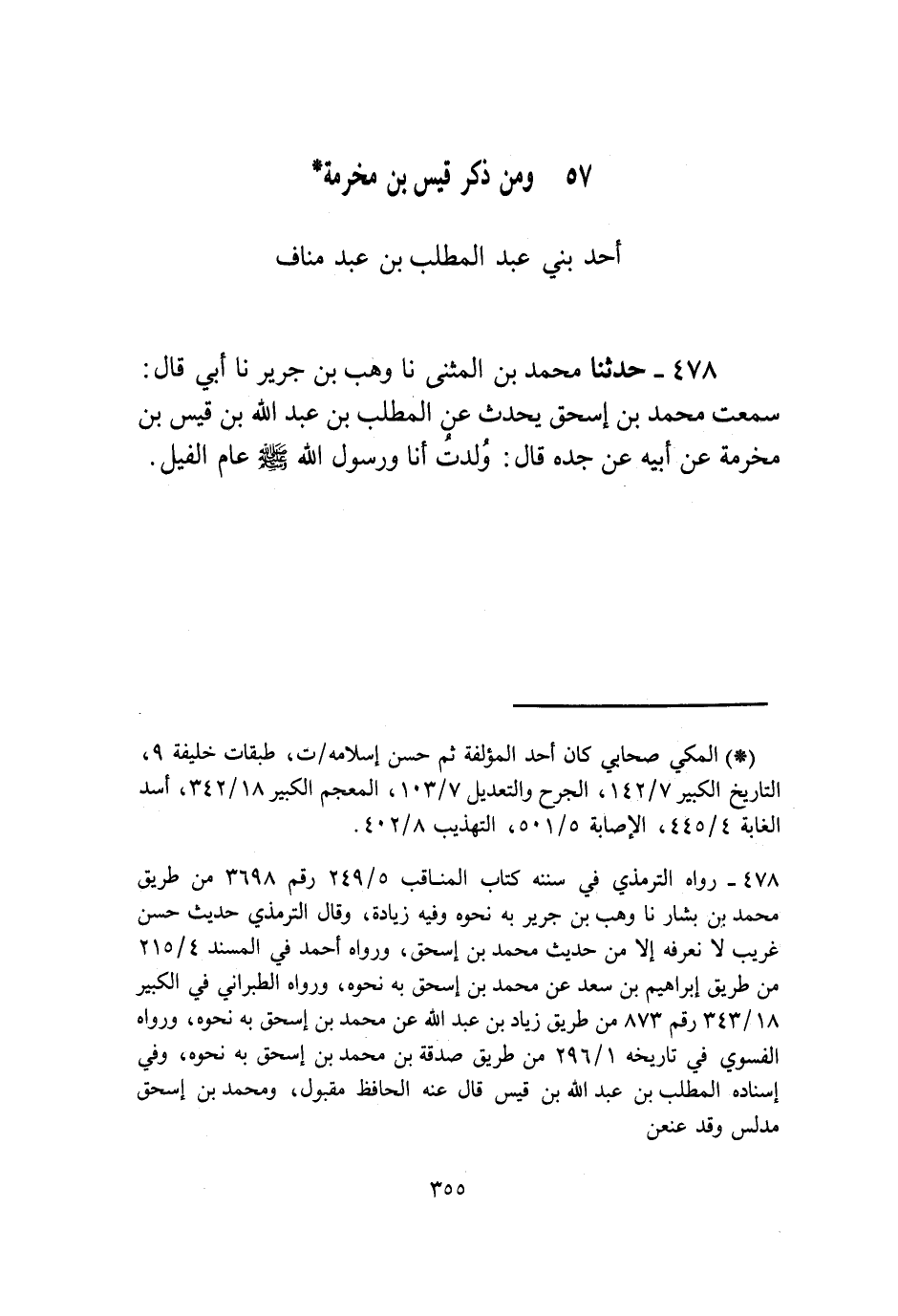 478 - حَدَّثَنَا مُحَمَّدُ بْنُ الْمُثَنَّى، نا وَهْبُ بْنُ جَرِيرٍ، نا أَبِي قَالَ: سَمِعْتُ مُحَمَّدَ بْنَ إِسْحَاقَ، يُحَدِّثُ عَنِ الْمُطَّلِبِ بْنِ عَبْدِ اللَّهِ بْنِ قَيْسِ بْنِ مَخْرَمَةَ، عَنْ أَبِيهِ، عَنْ جَدِّهِ، قَالَ: «§وُلِدْتُ أَنَا وَرَسُولُ اللَّهِ صَلَّى اللهُ عَلَيْهِ وَسَلَّمَ عَامَ الْفِيلِ»
