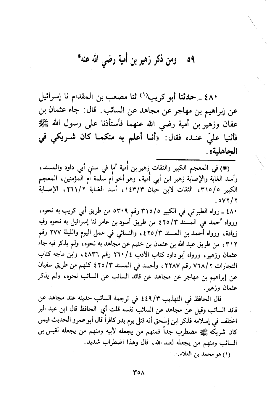 480 - حَدَّثَنَا أَبُو كُرَيْبٍ، ثنا مُصْعَبُ بْنُ الْمِقْدَامِ، نا إِسْرَائِيلُ، عَنْ إِبْرَاهِيمَ بْنِ مُهَاجِرٍ، عَنْ مُجَاهِدٍ، عَنِ السَّائِبِ، قَالَ: جَاءَ عُثْمَانُ بْنُ عَفَّانَ، وَزُهَيْرُ بْنُ أُمَيَّةَ رَضِيَ اللَّهُ عَنْهُمَا، فَاسْتَأْذَنَا عَلَى رَسُولِ اللَّهِ صَلَّى اللهُ عَلَيْهِ وَسَلَّمَ، فَأَثْنَيَا عَلَيَّ عِنْدَهُ، فَقَالَ: «§أَنَا أَعْلَمُ بِهِ مِنْكُمَا كَانَ شَرِيكِي فِي الْجَاهِلِيَّةِ»