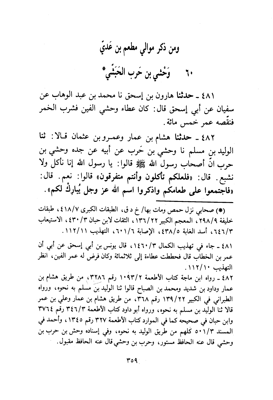 482 - حَدَّثَنَا هِشَامُ بْنُ عَمَّارٍ، وَعَمْرُو بْنِ عُثْمَانَ، قَالَا: ثنا الْوَلِيدُ بْنُ مُسْلِمٍ، نا وَحْشِيُّ بْنُ حَرْبٍ، عَنْ أَبِيهِ، عَنْ جَدِّهِ وَحْشِيِّ بْنِ حَرْبٍ، أَنَّ أَصْحَابَ رَسُولِ اللَّهِ صَلَّى اللهُ عَلَيْهِ وَسَلَّمَ، قَالُوا: يَا رَسُولَ اللَّهِ، إِنَّا نَأْكُلُ وَلَا نَشْبَعُ. قَالَ: «فَلَعَلَّكُمْ تَأْكُلُونَ وَأَنْتُمْ مُتَفَرِّقُونَ؟» قَالُوا: نَعَمْ. قَالَ: «§فَاجْتَمِعُوا عَلَى طَعَامِكُمْ، وَاذْكُرُوا اسْمَ اللَّهِ عَزَّ وَجَلَّ يُبَارِكْ لَكُمْ» وَمِنْ حَدِيثِهِ: