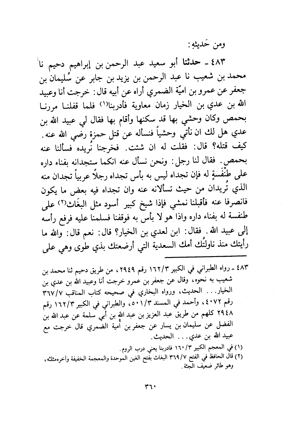 483 - حَدَّثَنَا أَبُو سَعِيدِ عَبْدُ الرَّحْمَنِ بْنُ إِبْرَاهِيمَ دُحَيْمٌ، نا مُحَمَّدُ بْنُ شُعَيْبٍ، نا عَبْدُ الرَّحْمَنِ بْنُ يَزِيدَ بْنِ جَابِرٍ، عَنْ سُلَيْمَانَ بْنِ جَعْفَرٍ، عَنْ عَمْرِو بْنِ أُمَيَّةَ الضَّمْرِيِّ، أُرَاهُ عَنْ أَبِيهِ، قَالَ: خَرَجْتُ أَنَا وَعُبَيْدُ اللَّهِ بْنُ عَدِيِّ بْنِ الْخِيَارِ، زَمَانَ مُعَاوِيَةَ فَأَدْرَبْنَا فَلَمَّا قَفَلْنَا مَرَرْنَا بِحِمْصَ وَكَانَ وَحْشِيٌّ بِهَا قَدْ سَكَنَهَا وَأَقَامَ بِهَا، فَقَالَ لِي عُبَيْدُ اللَّهِ بْنُ عَدِيٍّ: هَلْ لَكَ أَنْ نَأْتِيَ وَحْشِيًّا فَنَسْأَلَهُ، عَنْ قَتْلِ حَمْزَةَ رَضِيَ اللَّهُ عَنْهُ كَيْفَ قَتَلَهُ؟ قَالَ: فَقُلْتُ لَهُ: إِنْ شِئْتَ. فَخَرَجْنَا نُرِيدُهُ فَسَأَلْنَا عَنْهُ بِحِمْصَ، فَقَالَ لَنَا رَجُلٌ وَنَحْنُ نَسْأَلُ عَنْهُ: إِنَّكُمَا سَتَجِدَانِهَ بِفِنَاءِ دَارِهِ، عَلَى طِنْفِسَةٍ لَهُ، فَإِنْ تَجِدَاهُ لَيْسَ بِهِ بَأْسٌ تَجِدَاهُ رَجُلًا عَرَبِيًّا تَجِدَانِ مِنْهُ الَّذِي تُرِيدَانِ مِنْ حَيْثُ تَسْأَلَانِهِ عَنْهُ، وَإِنْ تَجِدَاهُ فِيهِ بَعْضُ مَا يَكُونُ فَانْصَرِفَا عَنْهُ. فَأَقْبَلْنَا نَمْشِي فَإِذَا شَيْخٌ كَبِيرٌ أَسْوَدُ مِثْلُ الْبُغَاثِ عَلَى طِنْفِسَةٍ لَهُ بِفِنَاءِ دَارِهِ، وَإِذَا هُوَ لَا بَأْسَ بِهِ، فَوَقَفْنَا فَسَلَّمْنَا عَلَيْهِ فَرَفَعَ رَأْسَهُ إِلَى عُبَيْدِ اللَّهِ فَقَالَ: ابْنٌ لِعَدِيِّ بْنِ الْخِيَارِ؟ قَالَ: نَعَمْ. قَالَ: وَاللَّهِ مَا رَأَيْتُكَ مُنْذُ نَاوَلْتُكَ أُمَّكَ السَّعْدِيَّةَ الَّتِي أَرْضَعَتْكَ بِذِي طُوًى وَهِيَ عَلَى -[361]- بَعِيرِهَا، فَلَمَّا وَقَفْتَ عَلَيَّ عَرَفْتُكَ. فَجَلَسْنَا إِلَيْهِ فَقُلْنَا لَهُ أَتَيْنَاكَ لِتُحَدِّثَنَا كَيْفَ كَانَ قَتْلُكَ حَمْزَةَ رَضِيَ اللَّهُ عَنْهُ؟ فَقَالَ: أَمَا أَنِّي سَأُحَدِّثُكُمَا كَمَا حَدَّثْتُ رَسُولَ اللَّهِ صَلَّى اللهُ عَلَيْهِ وَسَلَّمَ، §كُنْتُ غُلَامًا لِجُبَيْرِ بْنِ مُطْعِمٍ وَكَانَ عَمُّهُ طُعَيْمَةَ قُتِلَ يَوْمَ بَدْرٍ فَقَالَ لِي: إِنْ قَتَلْتَ حَمْزَةَ رَضِيَ اللَّهُ عَنْهُ، عَمَّ مُحَمَّدٍ صَلَّى اللهُ عَلَيْهِ وَسَلَّمَ، فَأَنْتَ حُرٌّ. وَكُنْتُ صَاحِبَ حَرْبَةٍ أَقْذِفُ بِهَا فَأَقَلُّ مَا أُخْطِئُ فَخَرَجْتُ مَعَ النَّاسِ وَجَاءَ حَمْزَةُ حَتَّى نَزَلْنَا مَنْزِلًا بِأُحِدٍ فَالْتَقَى النَّاسُ فَأَخَذْتُ حَرْبَتِي وَجَعَلْتُ انْظُرُ حَمْزَةَ رَضِيَ اللَّهُ عَنْهُ، حَتَّى رَأَيْتُهُ فِي عَرْضِ النَّاسِ مِثْلَ الْجَمَلِ الْأَوْرَقِ يَهُزُّ النَّاسَ بِسَيْفِهِ هَزًّا مَا يُبْقِي شَيْئًا فَوَاللَّهِ إِنِّي لَأَتَهَيَّأُ لَهُ قَدِ اسْتَتَرْتُ بِأَصْلِ الشَّجَرَةِ أَوْ حَجَرٍ إِذْ نَفَرَ مِنَ النَّاسِ سِبَاعُ بْنُ عَبْدِ الْعُزَّى فَلَمَّا رَآهُ حَمْزَةُ رَضِيَ اللَّهُ عَنْهُ قَالَ: هَلُمَّ إِلَيَّ يَا ابْنَ مُقَطِّعَةِ الْبُظُورِ فَضَرَبَهُ فَوَاللَّهِ لَكَأَنَّمَا أَخْطَأَ رَأْسَهُ، فَهَزَزْتُ حَرْبَتِي حَتَّى إِذَا رَضِيتُ مِنْهَا رَفَعْتُهَا عَلَيْهِ فَوَقَعَتْ بَيْنَ كَتِفَيْهِ حَتَّى خَرَجَتْ مِنْ ثَدْيَيْهِ، فَوَقَعَ الرَّجُلُ فَذَهَبَ لِيَنُوءَ بِهَا فَقَلَبْتُهُ فَتَرَكْتُهُ وَإِيَّاهَا وَاسْتَأْخَرْتُ عَنْهُ حَتَّى مَاتَ الرَّجُلُ فَقُمْتُ إِلَيْهِ فَأَخَذْتُهَا، ثُمَّ رَجَعْتُ إِلَى الْمُعَسْكَرِ فَقَعَدْتُ وَلَمْ يَكُنْ لِي حَاجَةٌ بِغَيْرِهِ وَإِنَّمَا قَتَلْتُهُ لِأُعْتَقَ، فَلَمَّا قَدِمْنَا مَكَّةَ عُتِقْتُ، وَأَقَمْتُ فَلَمَّا فَتَحَ اللَّهُ عَزَّ وَجَلَّ مَكَّةَ هَرَبْتُ فَدَخَلْتُ الطَّائِفَ فَلَمَّا خَرَجَ وَفْدُ الطَّائِفِ إِلَى رَسُولِ اللَّهِ ضَاقَتْ عَلَيَّ الْأَرْضُ بِمَا رَحُبَتْ فَقُلْتُ: أَلْحَقُ بِالْي