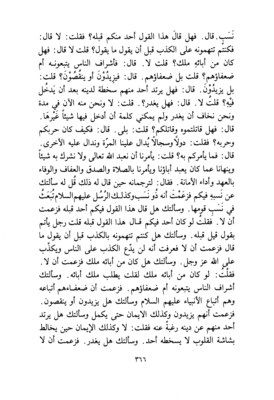 489 - حَدَّثَنَا يَعْقُوبُ بْنُ حُمَيْدِ بِنِ كَاسِبٍ، ثنا إِبْرَاهِيمُ بْنُ سَعْدٍ، عَنْ صَالِحِ بْنِ كَيْسَانَ، عَنِ ابْنِ شِهَابٍ، حَدَّثَنِي عُبَيْدُ اللهِ بْنُ عَبْدِ اللهِ بْنِ عُتْبَةَ، عَنِ ابْنِ عَبَّاسٍ رَضِيَ اللهُ عَنْهُ، أَنَّهُ أَخْبَرَهُ أَنَّ النَّبِيَّ صَلَّى اللهُ عَلَيْهِ وَسَلَّمَ، كَتَبَ إِلَى قَيْصَرَ، وَبَعَثَ بِكِتَابِهِ مَعَ دِحْيَةَ الْكَلْبِيِّ وَأَمَرَهُ أَنْ يَدْفَعَهُ إِلَى عَظِيمِ بُصْرَى، فَدَفَعَهُ عَظِيمُ بُصْرَى إِلَى قَيْصَرَ، وَكَانَ قَيْصَرُ لَمَّا كَشَفَ اللَّهُ تَعَالَى عَنْهُ جُنُودَ فَارِسَ مَشَى مِنْ حِمْصَ إِلَى إِيلْيَاءَ شُكْرًا لِمَا أَبْلَاهُ اللهُ عَزَّ وَجَلَّ، فَلَمَّا جَاءَ قَيْصَرَ كِتَابُ النَّبِيِّ صَلَّى اللهُ عَلَيْهِ وَسَلَّمَ، قَالَ حِينَ قَرَأَهُ: §الْتَمِسُوا لِي هَا هُنَا أَحَدًا مِنْ قَوْمِهِ أَسْأَلُهُ عَنْ رَسُولِ اللَّهِ صَلَّى اللهُ عَلَيْهِ وَسَلَّمَ، فَقَالَ ابْنُ عَبَّاسٍ: فَأَخْبَرَنِي أَبُو سُفْيَانَ بْنُ حَرْبٍ، أَنَّهُ كَانَ بِالشَّامِ فِي الْمُدَّةِ الَّتِي كَانَتْ بَيْنَ النَّبِيِّ صَلَّى اللهُ عَلَيْهِ وَسَلَّمَ، وَبَيْنَ كُفَّارِ قُرَيْشٍ. قَالَ أَبُو سُفْيَانَ فَوَجَدْنَا قَيْصَرَ بِبَعْضِ الشَّامِ فَانْطَلَقُوا بِي وَبِأَصْحَابِي حَتَّى قَدِمْنَا إِيلْيَاءَ فَأَدْخَلَنَا عَلَيْهِ فَإِذَا هُوَ جَالِسٌ فِي مَجْلِسِ مُلْكِهِ وَعَلَيْهِ التَّاجُ وَإِذَا حَوْلَهُ عُظَمَاءُ الرُّومُ، فَقَالَ لِتَرْجُمَانِهِ سَلْهُمْ أَيُّهُمْ أَقْرَبُ نَسَبًا إِلَى هَذَا الرَّجُلِ الَّذِي يَزْعُمُ أَنَّهُ نَبِيٌّ. قَالَ أَبُو سُفْيَانَ: فَقُلْتُ: أَنَا أَقْرَبُهُمْ إِلَيْهِ نَسَبًا. فَقَالَ: مَا قَرَابَتُهُ بَيْنَكَ وَبَيْنَهُ. قَالَ: قُلْتُ: هُوَ ابْنُ عَمِّي، وَلَيْسَ يَوْمَئِذٍ مِنْ بَنِي عَبْدِ مَنَافٍ غَيْرِي. قَالَ قَيْصَرُ: ادْنُهْ مِنِّي، ثُمَّ أَمَرَ بِأَصْحَابِي يُجْعَلُوا خَلْفَ ظَهْرِي عِنْدَ كَتِفِي، ثُمَّ قَالَ لِتَرْجُمَانِهِ: قُلْ لَهُمْ: إِنِّي سَائِلٌ هَذَا الرَّجُلَ عَنْ هَذَا الرَّجُلِ الَّذِي يَزْعُمُ أَنَّهُ نَبِيٌّ. فَإِنْ كَذَبَ فَكَذِّبُوهُ. قَالَ أَبُو سُفْيَانَ: فَوَاللَّهِ لَوْلَا الْحَيَاءُ يَوْمَئِذٍ بِأَنْ يَأْثِرَ أَصْحَابِي عَلَيَّ الْكَذِبَ لَحَدَّثْتُهُ عَنْهُ حِينَ سَأَلَنِي وَلَكِنِ اسْتَحْيَيْتُ أَنْ يَأْثِرُوا عَلَيَّ الْكَذِبَ فَصَدَقْتُهُ عَنْهُ. فَقَالَ لِتَرْجُمَانِهِ: قُلْ لَهُ: كَيْفَ نَسَبُ هَذَا الرَّجُلِ فِيكُمْ؟ فَقُلْتُ لَهُ: هُوَ فِينَا ذُو نَسَبٍ قَالَ: فَهَلْ قَالَ هَذَا الْقَوْلَ أَحَدٌ مِنْكُمْ قَبْلَهُ؟ فَقُلْتُ: لَا. قَالَ: فَكُنْتُمْ تَتَّهِمُونَهُ عَلَى الْكَذِبِ قَبْلَ أَنْ يَقُولَ مَا يَقُولُ؟ قُلْتُ: لَا. قَالَ: فَهَلْ كَانَ مِنْ آبَائِهِ مَلِكٌ؟ قُلْتُ: لَا. قَالَ: فَأَشْرَافُ النَّاسِ يَتَّبِعُونَهُ أَمْ ضُعَفَاؤُهُمْ؟ قُلْتُ: بَلْ ضُعَفَاؤُهُمْ. قَالَ: فَيَزِيدُونَ أَوْ يَنْقُصُونَ؟ قُلْتُ: بَلْ يَزِيدُونَ. قَالَ: فَهَلْ يَرْتَدُّ أَحَدٌ مِنْهُمْ سَخْطَةً لِدِينِهِ بَعْدَ أَنْ يَدْخُلَ فِيهِ؟ قُلْتُ: لَا. قَالَ: فَهَلْ يَغْدِرُ؟ قُلْتُ: لَا. وَنَحْنُ مِنْهُ الْآنَ فِي مُدَّةٍ، وَنَحْنُ نَخَافُ أَنْ يَغْدِرَ وَلَمْ يُمْكِنِّي كَلِمَةٌ أَنْ أُدْخِلَ فِيهَا شَيْئًا غَيْرَهَا. قَالَ: فَهَلْ قَاتَلْتُمُوهُ وَقَاتَلَكُمْ؟ قُلْتُ: بَلَى. قَالَ: فَكَيْفَ كَانَ حَرْبُكُمْ وَحَرْبُهُ؟ فَقُلْتُ: دُوَلًا وَسِجَالًا يُدَالُ عَلَيْنَا الْمَرَّةَ وَنُدَالُ عَلَيْهِ الْأُخْرَى. قَالَ: فَمَا يَأْمُرُكُمْ بِهِ؟ قُلْتُ: يَأْمُرُنَا أَنْ نَعْبُدَ اللَّهَ تَعَالَى وَلَا نُشْرِكَ بِهِ شَيْئًا وَيَنْهَانَا عَمَّا كَانَ يَعْبُدُ آبَاؤُنَا، وَيَأْمُرُنَا بِالصَّلَاةِ و