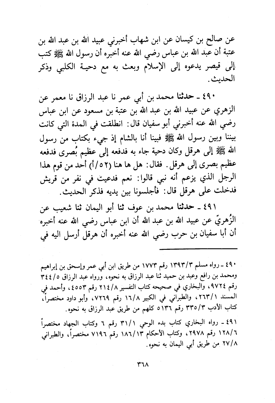 490 - حَدَّثَنَا عُبَيْدُ اللَّهِ بْنُ سَعْدِ بْنِ إِبْرَاهِيمَ، نا عَمِّي، عَنِ ابْنِ أَخِي الزُّهْرِيِّ، عَنْ عَمِّهِ، قَالَ: أَخْبَرَنِي عُبَيْدُ اللَّهِ بْنُ عَبْدِ اللَّهِ بْنِ عُتْبَةَ بْنِ مَسْعُودٍ، أَنَّ عَبْدَ اللَّهِ بْنَ عَبَّاسٍ رَضِيَ اللَّهُ عَنْهُ، أَخْبَرَهُ أَنَّ رَسُولَ اللَّهِ صَلَّى اللهُ عَلَيْهِ وَسَلَّمَ §كَتَبَ إِلَى قَيْصَرَ يَدْعُوهُ إِلَى الْإِسْلَامِ فَبَعَثَ بِكِتَابِهِ مَعَ دِحْيَةَ الْكَلْبِيِّ رَضِيَ اللَّهُ عَنْهُ وَأَمَرَهُ رَسُولُ اللَّهِ صَلَّى اللهُ عَلَيْهِ وَسَلَّمَ أَنْ يَدْفَعَهُ إِلَى عَظِيمِ بُصْرَى لِيَدْفَعَهُ عَظِيمُ بُصْرَى إِلَى قَيْصَرَ فَدَفَعَهُ عَظِيمُ بُصْرَى إِلَى قَيْصَرَ وَكَانَ قَيْصَرُ لَمَّا كَشَفَ اللَّهُ عَزَّ وَجَلَّ عَنْهُ، جُنُودَ فَارِسَ مَشَى إِلَى إِيلِيَا عَلَى الزَّرَابِيِّ يُبْسَطُ لَهُ قَالَ عَبْدُ اللَّهِ بْنُ عَبَّاسٍ: فَأَخْبَرَنِي أَبُو سُفْيَانَ أَنَّهُ كَانَ بِالشَّامِ فِي رِجَالٍ مِنْ قُرَيْشٍ قَدِمُوا تُجَّارًا فِي الْمُدَّةِ الَّتِي كَانَتْ بَيْنَ رَسُولِ اللَّهِ صَلَّى اللهُ عَلَيْهِ وَسَلَّمَ وَكُفَّارِ قُرَيْشٍ فَذَكَرَ الْحَدِيثَ
