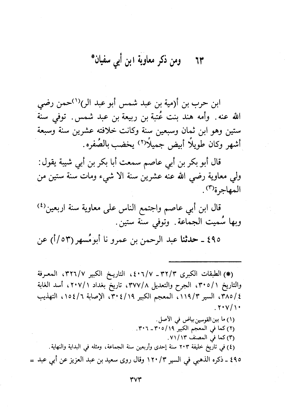 §وَمِنْ ذِكْرِ مُعَاوِيَةَ بْنِ أَبِي سُفْيَانَ بْنِ حَرْبِ بْنِ أُمَيَّةَ بْنِ عَبْدِ شَمْسٍ أَبُو عَبْدِ الرَّحْمَنِ رَضِيَ اللَّهُ عَنْهُ وَأُمُّهُ هِنْدُ بِنْتُ عُتْبَةَ بْنِ رَبِيعَةَ بْنِ عَبْدِ شَمْسٍ، تُوُفِّيَ سَنَةَ سِتِّينَ وَهُوَ ابْنُ ثَمَانٍ وَسَبْعِينَ سَنَةً، وَكَانَتْ خِلَافَتُهُ عِشْرِينَ سَنَةً وَسَبْعَةَ أَشْهُرٍ، وَكَانَ طَوِيلًا أَبْيَضَ جَمِيلًا يَخْضِبُ بِالصُّفْرَةِ، قَالَ أَبُو بَكْرِ بْنُ أَبِي عَاصِمٍ: سَمِعْتُ أَبَا بَكْرِ بْنَ أَبِي شَيْبَةَ يَقُولُ: وَلِي مُعَاوِيَةُ رَضِيَ اللَّهُ عَنْهُ عِشْرِينَ سَنَةً إِلَّا شَيْئًا، وَمَاتَ سَنَةَ سِتِّينَ مِنَ الْمُهَاجَرَةِ قَالَ ابْنُ أَبِي عَاصِمٍ: وَاجْتَمَعَ النَّاسُ عَلَى مُعَاوِيَةَ سَنَةَ أَرْبَعِينَ وَبِهَا سُمِّيَتِ الْجَمَاعَةُ وَتُوُفِّيَ سَنَةَ سِتِّينَ
