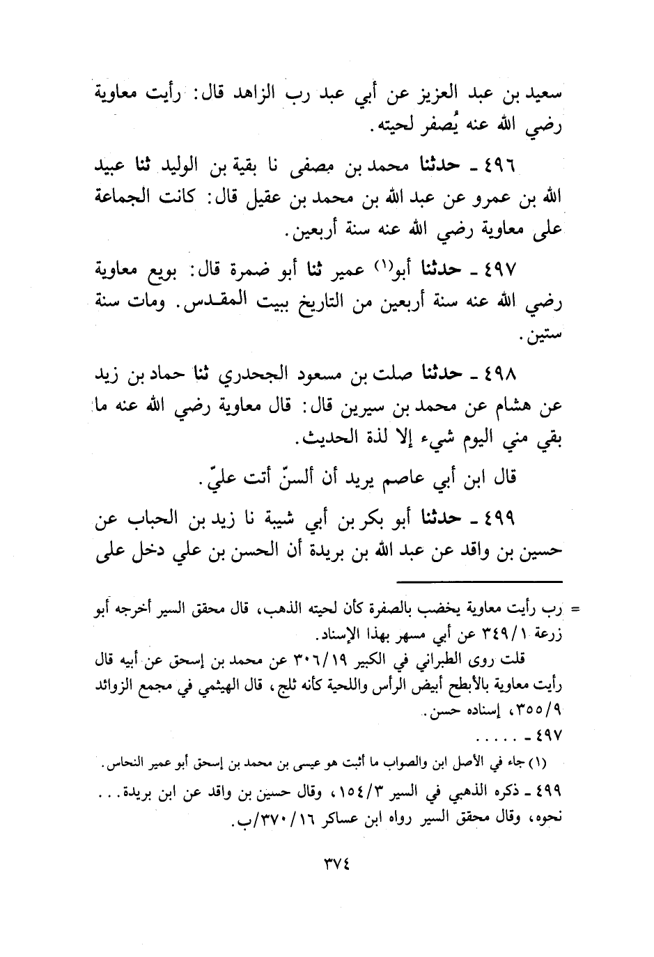497 - حَدَّثَنَا أَبُو عُمَيْرٍ، ثنا أَبُو ضَمْرَةَ، قَالَ: «§بُويِعَ مُعَاوِيَةُ رَضِيَ اللَّهُ عَنْهُ سَنَةَ، أَرْبَعِينَ مِنَ التَّارِيخِ بِبَيْتِ الْمَقْدِسِ وَمَاتَ سَنَةَ سِتِّينَ»