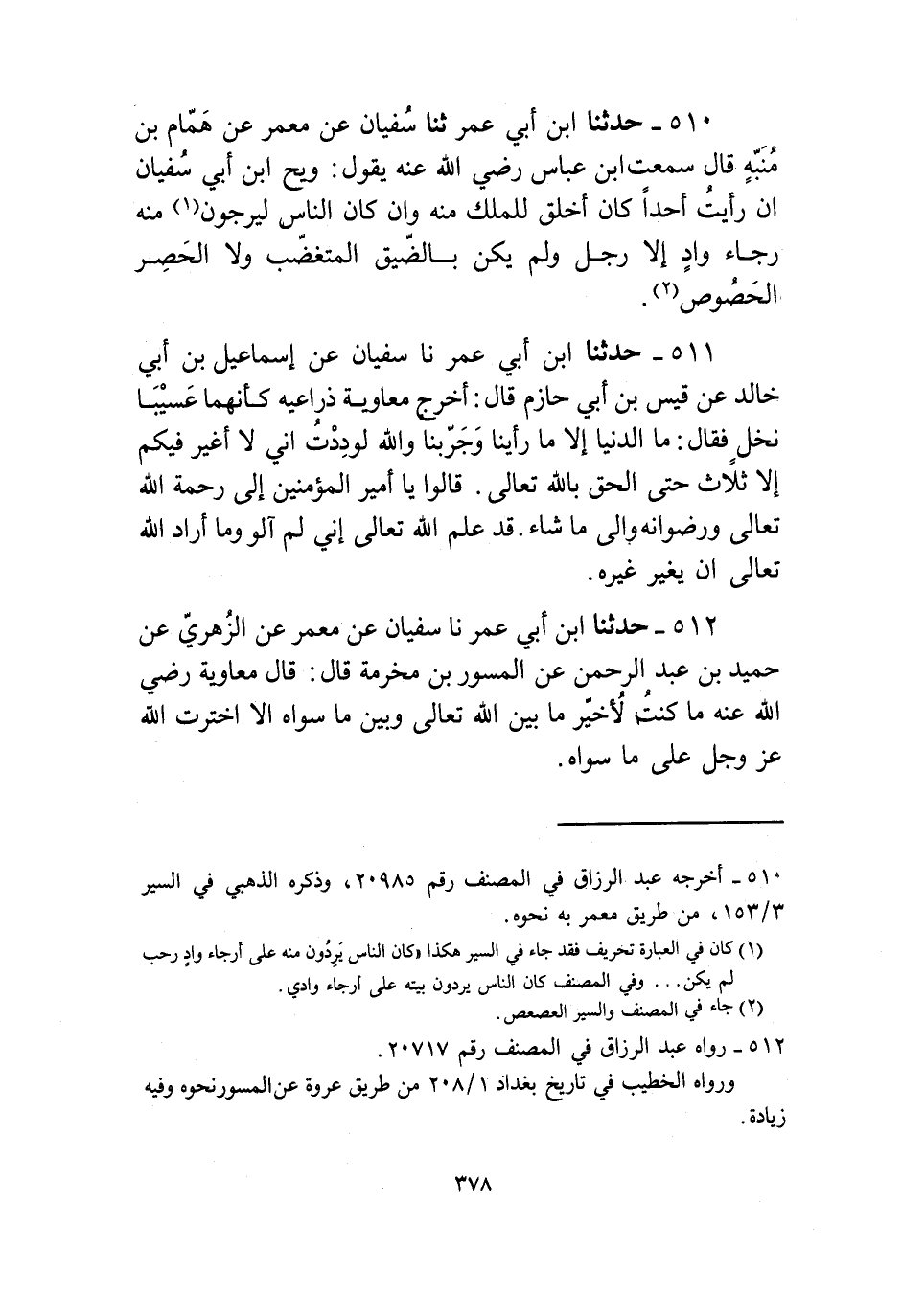 510 - حَدَّثَنَا ابْنُ أَبِي عُمَرَ، ثنا سُفْيَانُ، عَنْ مَعْمَرٍ، عَنْ هَمَّامِ بْنِ مُنَبِّهٍ، قَالَ: سَمِعْتُ ابْنَ عَبَّاسٍ رَضِيَ اللَّهُ عَنْهُ، يَقُولُ: «وَيْحَ ابْنِ أَبِي سُفْيَانَ إِنْ §رَأَيْتُ أَحَدًا كَانَ أَخْلَقَ لِلْمُلْكِ مِنْهُ، وَإِنْ كَانَ النَّاسُ لَيَرْجُونَ مِنْهُ رَجَاءَ، وَادٍ إِلَّا رَجُلٌ، وَلَمْ يَكُنْ بِالضَّيِّقِ الْمُتَغَضِّبِ وَلَا الْحَصِرِ الْحَصُوصِ»