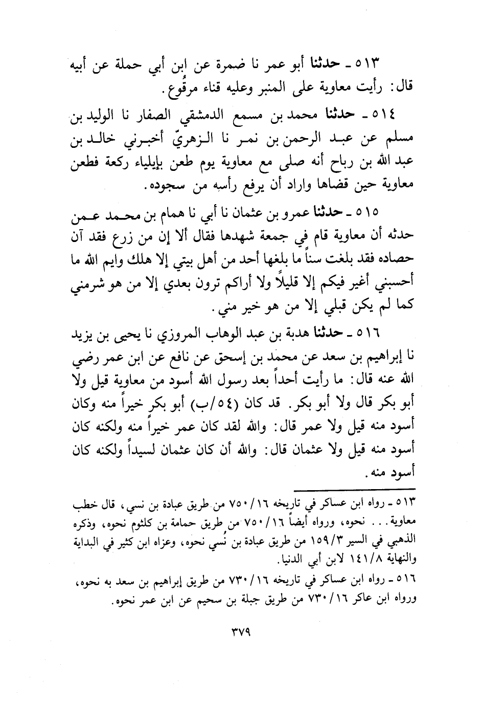 516 - حَدَّثَنَا هَدِيَّةُ بْنُ عَبْدِ الْوَهَّابِ الْمَرْوَزِيُّ، نا يَحْيَى بْنُ يَزِيدَ، نا إِبْرَاهِيمُ بْنُ سَعْدٍ، عَنْ مُحَمَّدِ بْنِ إِسْحَاقَ، عَنْ نَافِعٍ، عَنِ ابْنِ عُمَرَ رَضِيَ اللَّهُ عَنْهُ، قَالَ: «§مَا رَأَيْتُ أَحَدًا بَعْدَ رَسُولِ اللَّهِ أَسْوَدَ مِنْ مُعَاوِيَةَ» ، قِيلَ: وَلَا أَبُو بَكْرٍ؟ قَالَ: «وَلَا أَبُو بَكْرٍ، قَدْ كَانَ أَبُو بَكْرٍ خَيْرًا مِنْهُ، وَكَانَ أَسْوَدَ مِنْهُ» قِيلَ: وَلَا عُمَرُ؟ قَالَ: «وَاللَّهِ لَقَدْ كَانَ عُمَرُ خَيْرًا مِنْهُ وَلَكِنَّهُ كَانَ أَسْوَدَ مِنْهُ» . قِيلَ: وَلَا عُثْمَانُ؟ قَالَ: «وَاللَّهِ إِنْ كَانَ عُثْمَانُ لَسَيِّدًا وَلَكِنَّهُ كَانَ أَسْوَدَ مِنْهُ»
