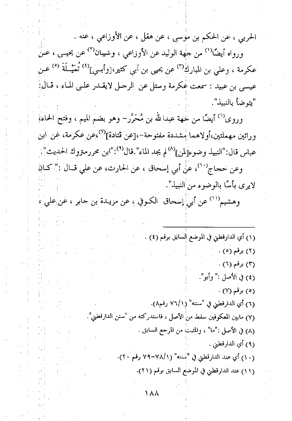 ورواه أيضا من جهة الوليد عن الأوزاعي، وشيبان عن يحيى، عن عكرمة، وعلي بن المبارك عن يحيى بن أبي كثير، [وأبي] تميلة عن عيسى بن عبيد: سمعت عكرمة وسئل عن الرجل لا يقدر على الماء، قال: "يتوضأ بالنبيذ".