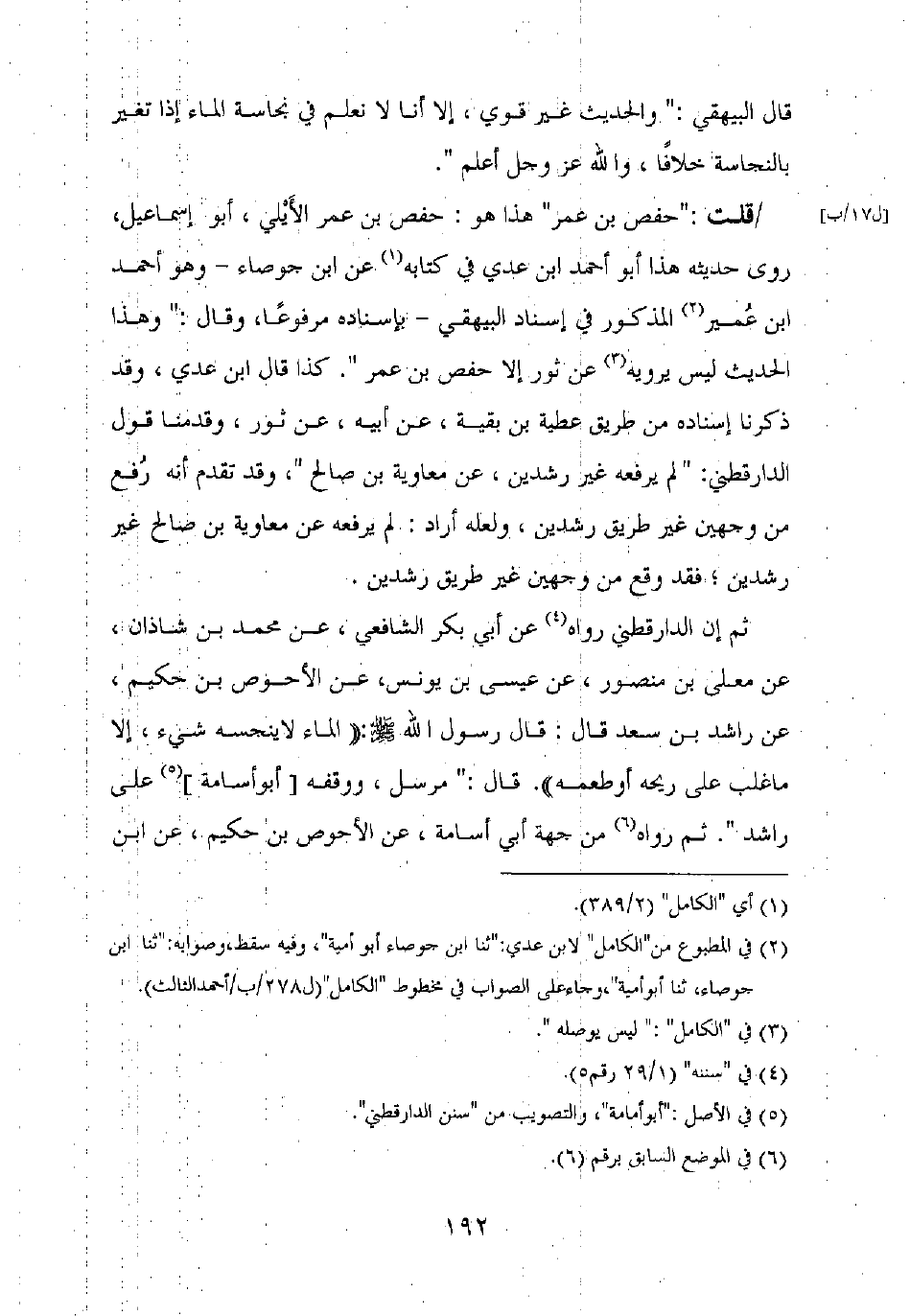 ثم إن الدارقطني رواه عن أبي بكر الشافعي، عن محمد بن شاذان، عن معلى بن منصور، عن عيسى بن يونس، عن الأحوص بن حكيم، عن راشد بن سعد قال: قال رسول الله صلى الله عليه وسلم "الماء لا ينجسه شيء، إلا ما غلب على ريحه أو طعمه". قال: "مرسل، ووقفه [أبو أسامة] على راشد". ثم رواه من جهة أبي أسامة، عن الأحوص بن حكيم، عن ابن