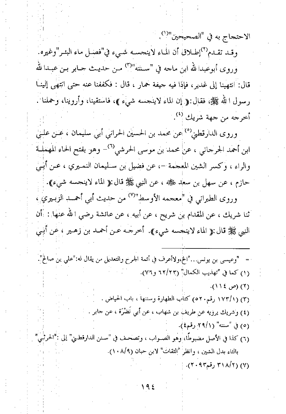 وروى الدارقطني عن محمد بن الحسين الحراني أبي سليمان، عن علي بن أحمد الجرجاني، عن محمد بن موسى الحرشي – وهو بفتح الحاء المهملة والراء، وكسر الشين المعجمة -، عن فضيل بن سليمان النميري، عن أبي حازم، عن سهل بن سعد رضي الله عنه، عن النبي صلى الله عليه وسلم قال:"الماء لا ينجسه شيء".