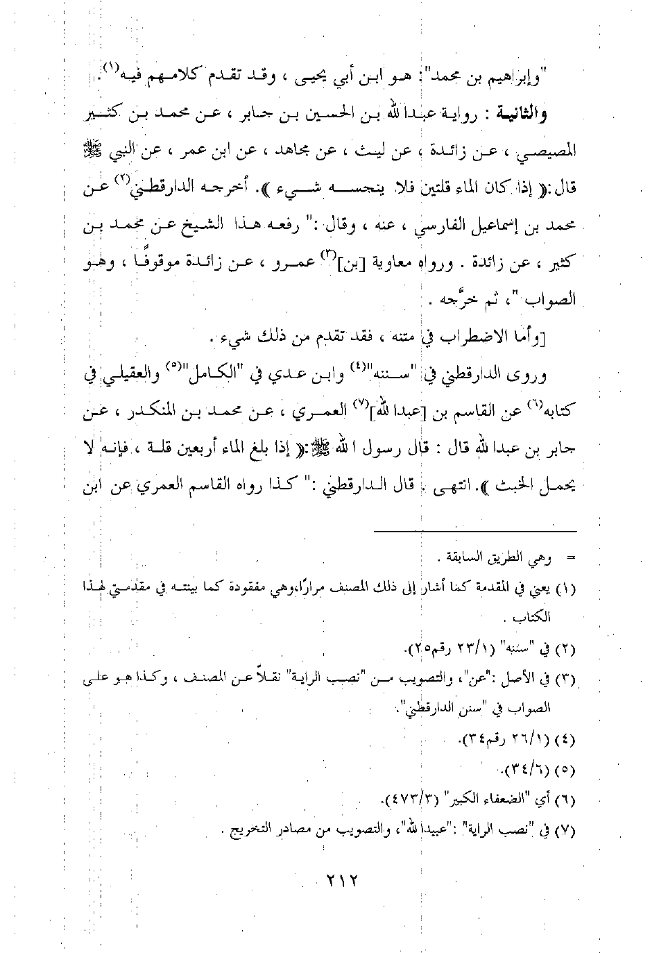 وروى الدارقطني في "سننه" وابن عدي في "الكامل" والعقيلي في كتابه عن القاسم بن [عبد الله] العمري، عن محمد بن المنكدر، عن جابر بن عبد الله قال: قال رسول الله صلى الله عليه وسلم "إذا بلغ الماء أربعين قلة، فإنه لا يحمل الخبث". انتهى. قال الدارقطني: "كذا رواه القاسم العمري عن ابن