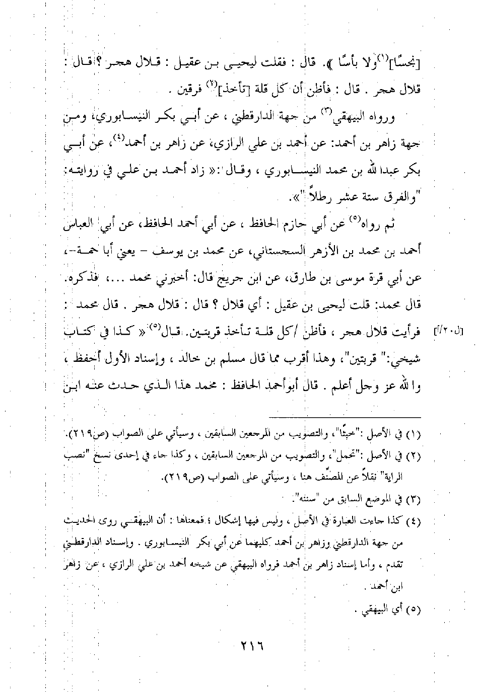 ورواه البيهقي من جهة الدارقطني، عن أبي بكر النيسابوري، ومن جهة زاهر بن أحمد: عن أحمد بن علي الرازي، عن زاهر بن أحمد، عن أبي بكر عبد الله بن محمد النيسابوري، وقال:"زاد أحمد بن علي في روايته: "والفرق ستة عشر رطلا".