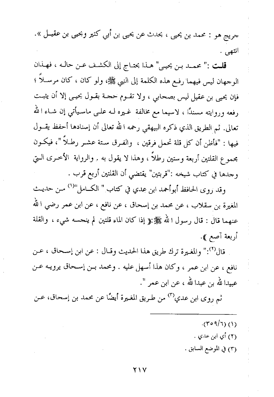 وقد روى الحافظ أبو أحمد ابن عدي في كتاب "الكامل" من حديث المغيرة بن سقلاب، عن محمد بن إسحاق، عن نافع، عن ابن عمر رضي الله عنهما قال: قال رسول الله صلى الله عليه وسلم "إذا كان الماء قلتين لم ينجسه شيء، والقلة أربعة آصع".