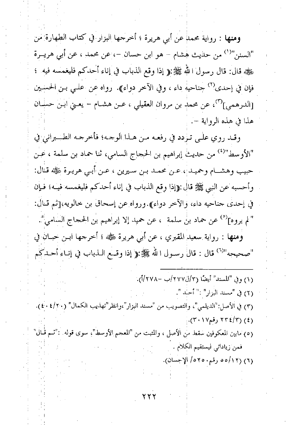 ومنها: رواية محمد عن أبي هريرة، أخرجها البزار في كتاب الطهارة من "السنن" من حديث هشام – هو ابن حسان -، عن محمد، عن أبي هريرة رضي الله عنه قال: قال رسول الله صلى الله عليه وسلم: "إذا وقع الذباب في إناء أحدكم فليغمسه فيه، فإن في إحدى جناحيه داء، وفي الآخر دواء". رواه عن علي بن الحسين [الدرهمي]، عن محمد بن مروان العقيلي، عن هشام – يعني ابن حسان هذا في هذه الرواية -.