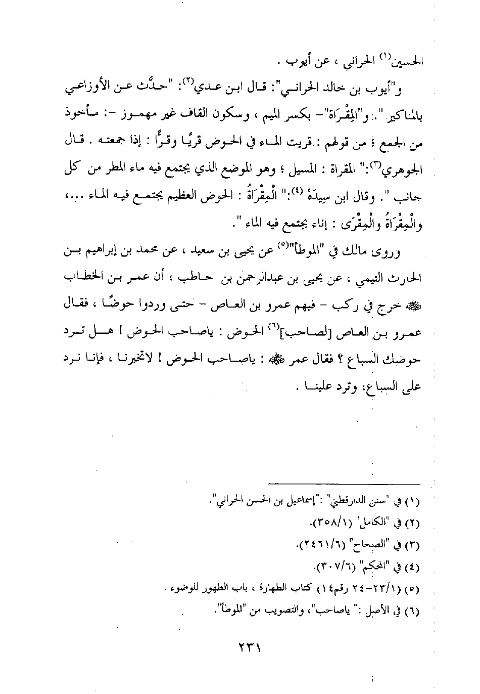 وروى مالك في "الموطأ" عن يحيى بن سعيد، عن محمد بن إبراهيم بن الحارث التيمي، عن يحيى بن عبد الرحمن بن حاطب، أن عمر بن الخطاب رضي الله عنه خرج في ركب – فيهم عمرو بن العاص – حتى وردوا حوضا، فقال عمرو بن العاص [لصاحب] الحوض: يا صاحب الحوض! هل ترد حوضك السباع؟ فقال عمر رضي الله عنه: يا صاحب الحوض! لا تخبرنا، فإنا نرد على السباع، وترد علينا.