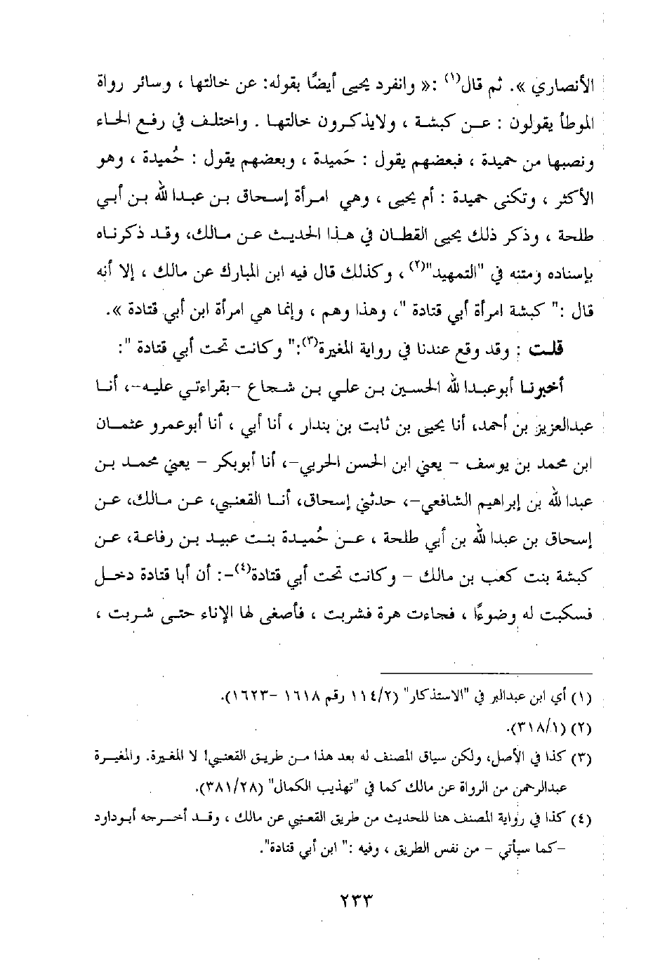 الأنصاري ". ثم قال: "وانفرد يحيى أيضا بقوله: عن خالتها، وسائر رواة الموطأ يقولون: عن كبشة، ولا يذكرون خالتها. واختلف في رفع الحاء ونصبها من حميدة، فبعضهم يقول: حميدة، وبعضهم يقول: حُميدة، وهو الأكثر، وتكنى حميدة: أم يحيى، وهي امرأة إسحاق بن عبد الله بن أبي طلحة، وذكر ذلك يحيى القطان في هذا الحديث عن مالك، وقد ذكرناه بإسناده ومتنه في "التمهيد"، وكذلك قال فيه ابن المبارك عن مالك، إلا أنه قال:"كبشة امرأة أبي قتادة"، وهذا وهم، وإنما هي امرأة ابن أبي قتادة ".