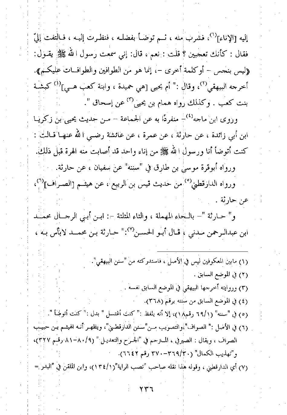 وروى ابن ماجه – منفردا به عن الجماعة – من حديث يحيى بن زكريا ابن أبي زائدة، عن حارثة، عن عمرة، عن عائشة رضي الله عنها قالت: كنت أتوضأ أنا ورسول الله صلى الله عليه وسلم من إناء واحد قد أصابت منه الهرة قبل ذلك.