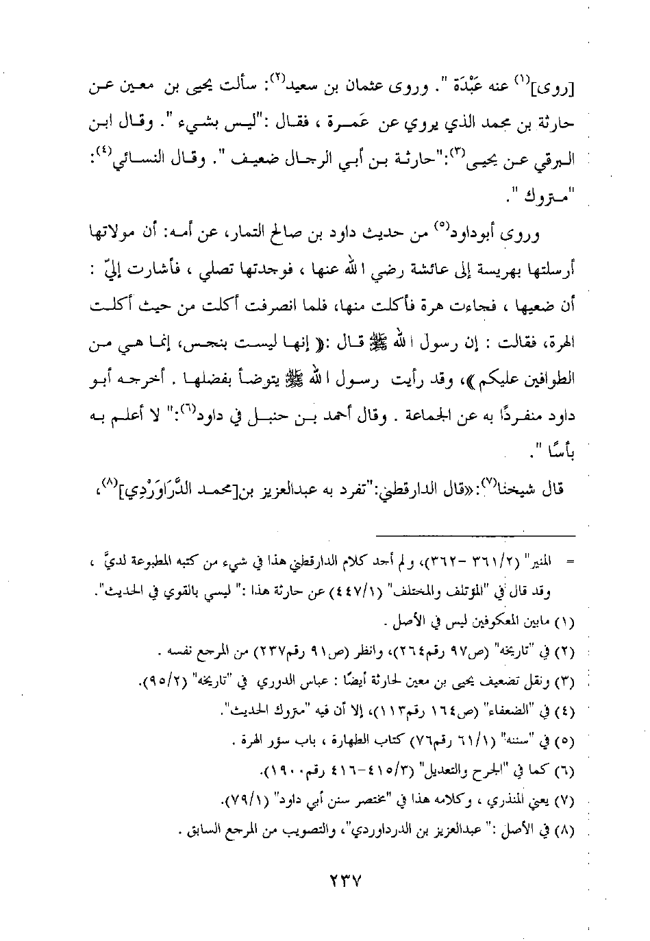قال شيخنا: "قال الدارقطني: "تفرد به عبد العزيز بن [محمد الدراوردي]، عن داود بن [صالح]، عن أمه بهذه الألفاظ".