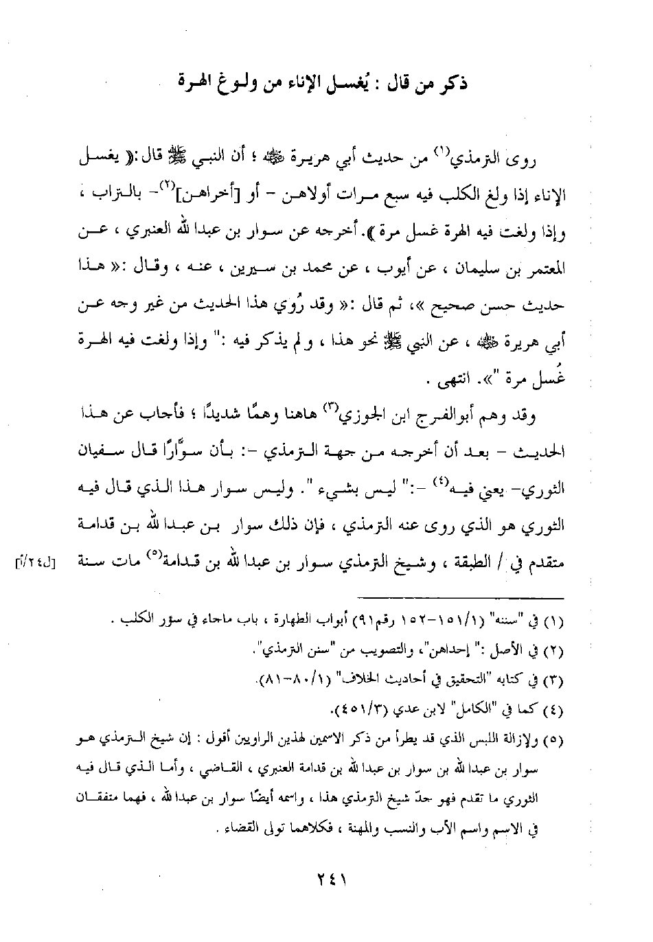 روى الترمذي من حديث أبي هريرة رضي الله عنه، أن النبي صلى الله عليه وسلم قال: "يغسل الإناء إذا ولغ الكلب فيه سبع مرات أولاهن – أو [أخراهن] – بالتراب، وإذا ولغت فيه الهرة غسل مرة". أخرجه عن سوار بن عبد الله العنبري، عن المعتمر بن سليمان، عن أيوب، عن محمد بن سيرين، عنه، وقال: "هذا حديث حسن صحيح"، ثم قال: "وقد روي هذا الحديث من غير وجه عن أبي هريرة رضي الله عنه، عن النبي صلى الله عليه وسلم نحو هذا، ولم يذكر فيه:"وإذا ولغت فيه الهرة غسل مرة ". انتهى.