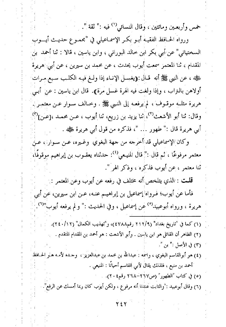 ورواه الحافظ الفقيه أبو بكر الإسماعيلي في "مجموع حديث أيوب السختياني" عن أبي بكر بن خالد البوراني، وابن ياسين، قالا: ثنا أحمد بن المقدام، ثنا المعتمر سمعت أيوب يحدث، عن محمد بن سيرين، عن أبي هريرة رضي الله عنه، عن النبي صلى الله عليه وسلم أنه قال: "يغسل الإناء إذا ولغ فيه الكلب سبع مرات أولاهن بالتراب، وإذا ولغت فيه الهرة غسل مرة". قال ابن ياسين: عن أبي هريرة مثله موقوف، لم يرفعه إلى النبي صلى الله عليه وسلم. وخالف سوار عن معتمر.