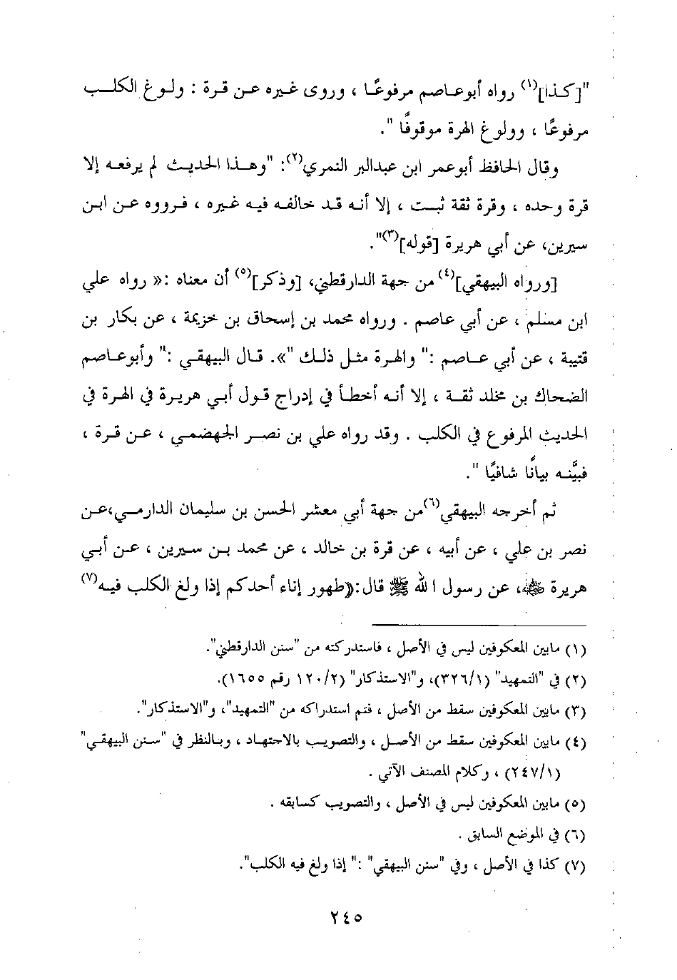 [ورواه البيهقي] من جهة الدارقطني، [وذكر] أن معناه: "رواه علي ابن مسلم، عن أبي عاصم. ورواه محمد بن إسحاق بن خزيمة، عن بكار بن قتيبة، عن أبي عاصم: "والهرة مثل ذلك". قال البيهقي: "وأبو عاصم الضحاك بن مخلد ثقة، إلا أنه أخطأ في إدراج قول أبي هريرة في الهرة في الحديث المرفوع في الكلب. وقد رواه علي بن نصر الجهضمي، عن قرة، فبينه بيانا شافيا".