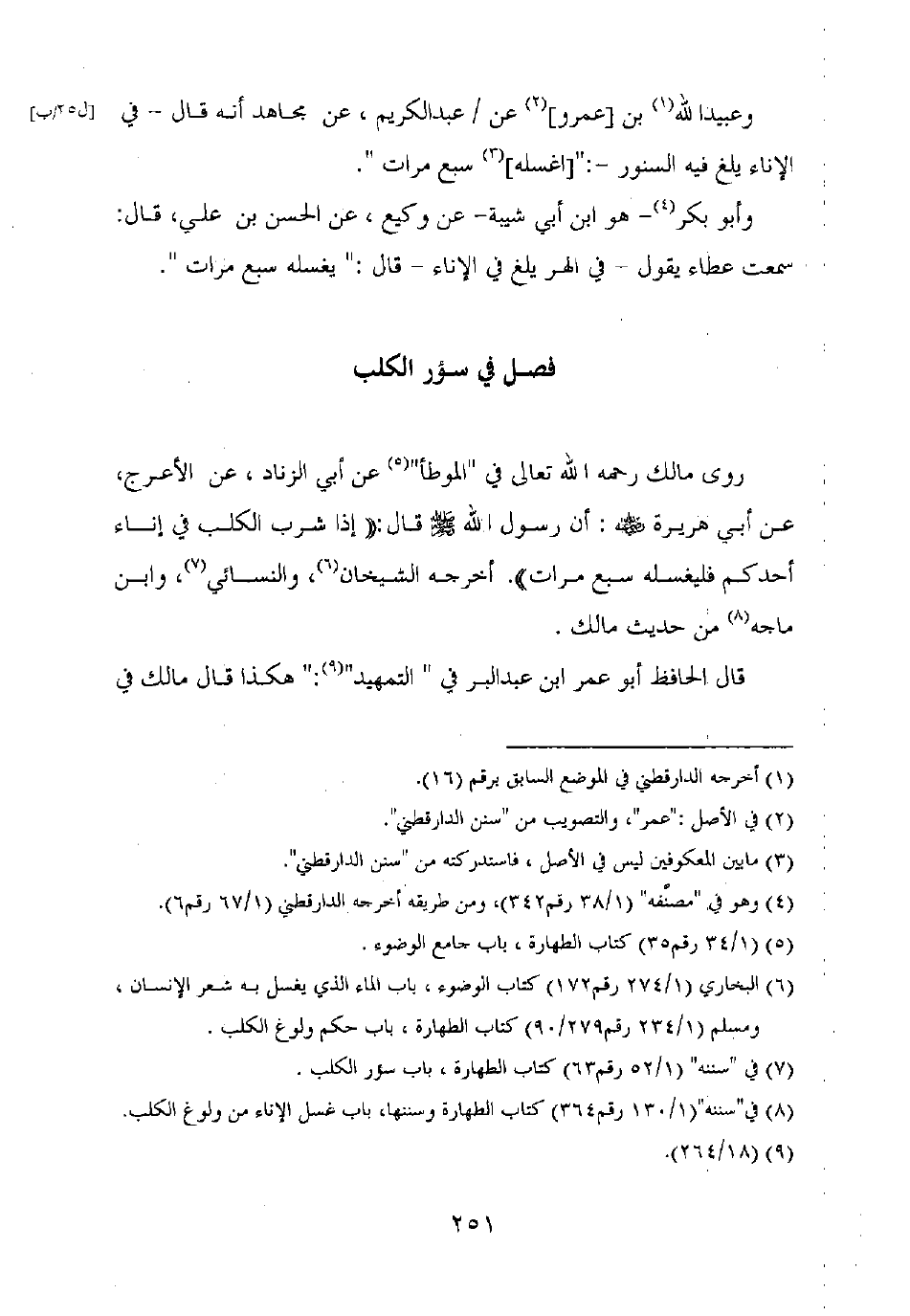 روى مالك رحمه الله تعالى في "الموطأ" عن أبي الزناد، عن الأعرج، عن أبي هريرة رضي الله عنه: أن رسول الله صلى الله عليه وسلم قال: "إذا شرب الكلب في إناء أحدكم فليغسله سبع مرات". أخرجه الشيخان والنسائي، وابن ماجه من حديث مالك.
