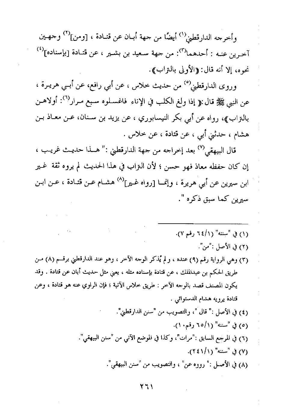 وأخرجه الدارقطني أيضا من جهة أبان عن قتادة، [ومن] وجهين آخرين عنه: أحدهما: من جهة سعيد بن بشير، عن قتادة [بإسناده] نحوه، إلا أنه قال: "الأولى بالتراب".