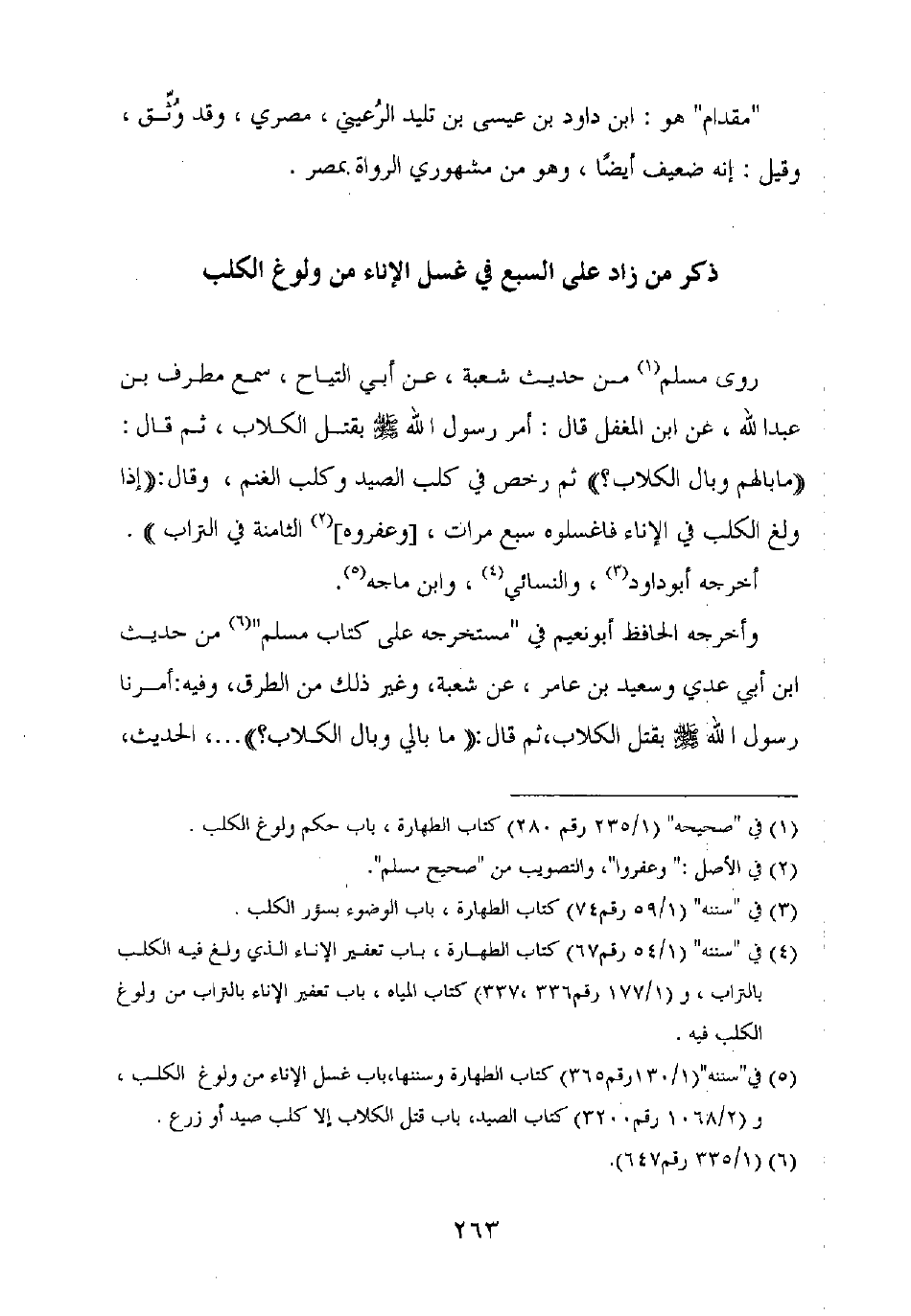 روى مسلم من حديث شعبة، عن أبي التياح، سمع مطرف بن عبد الله، عن ابن المغفل قال: أمر رسول الله صلى الله عليه وسلم بقتل الكلاب، ثم قال: "ما بالهم وبال الكلاب؟ " ثم رخص في كلب الصيد وكلب الغنم، وقال: "إذا ولغ الكلب في الإناء فاغسلوه سبع مرات، [وعفروه] الثامنة في التراب".