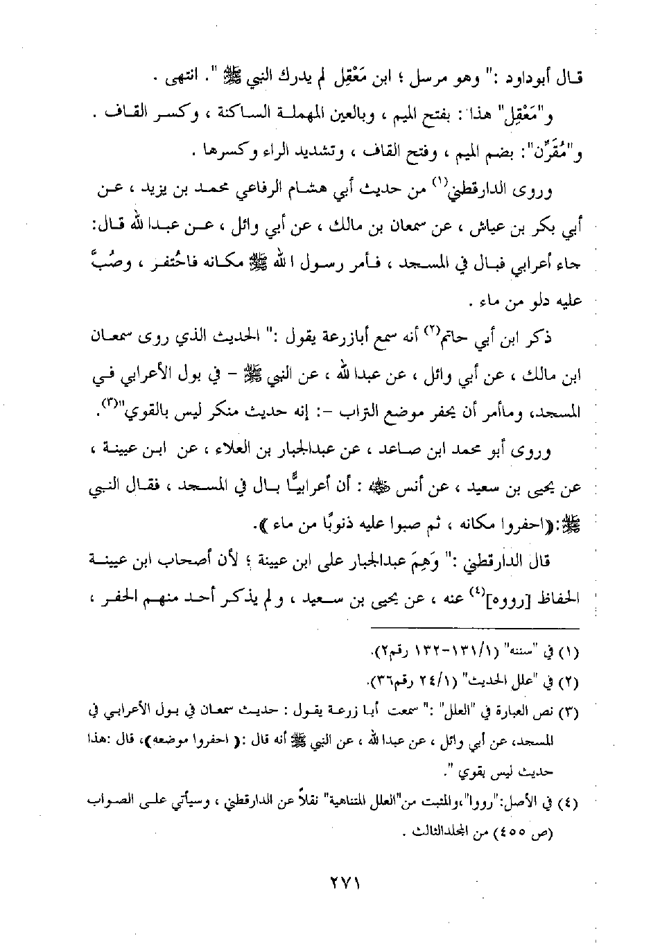 وروى الدارقطني من حديث أبي هشام الرفاعي محمد بن يزيد، عن أبي بكر بن عياش، عن سمعان بن مالك، عن أبي وائل، عن عبد الله قال: جاء أعرابي فبال في المسجد، فأمر رسول الله صلى الله عليه وسلم مكانه فاحتفر، وصب عليه دلو من ماء.