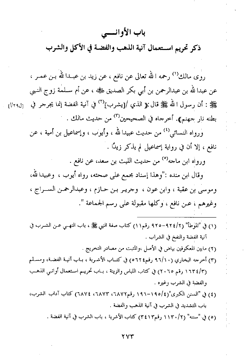 روى مالك رحمه الله تعالى عن نافع، عن زيد بن عبد الله بن عمر، عن عبد الله بن عبد الرحمن بن أبي بكر الصديق رضي الله عنه، عن أم سلمة زوج النبي صلى الله عليه وسلم: أن رسول الله صلى الله عليه وسلم قال: "الذي [يشرب] في آنية الفضة إنما يجرجر في بطنه نار جهنم". أخرجاه في الصحيحين من حديث مالك.