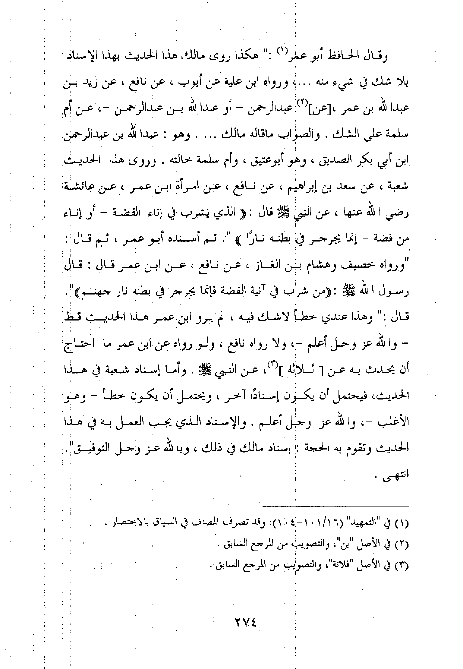 وقال الحافظ أبو عمر: "هكذا روى مالك هذا الحديث بهذا الإسناد بلا شك في شيء منه .... ، ورواه ابن علية عن أيوب، عن نافع، عن زيد بن عبد الله بن عمر، [عن] عبد الرحمن – أو عبد الله بن عبد الرحمن -، عن أم سلمة على الشك. والصواب ما قاله مالك ... وهو: عبد الله بن عبد الرحمن بن أبي بكر الصديق، وهو أبو عتيق، وأم سلمة خالته. وروى هذا الحديث شعبة، عن سعد بن إبراهيم، عن نافع، عن امرأة ابن عمر، عن عائشة رضي الله عنها، عن النبي صلى الله عليه وسلم قال: "الذي يشرب في إناء الفضة – أو إناء من فضة – إنما يجرجر في بطنه نارا". ثم أسنده أبو عمر، ثم قال: "ورواه خصيف وهشام بن الغاز، عن نافع، عن ابن عمر قال: قال رسول الله صلى الله عليه وسلم: "من شرب في آنية الفضة فإنما يجرجر في بطنه نار جهنم".