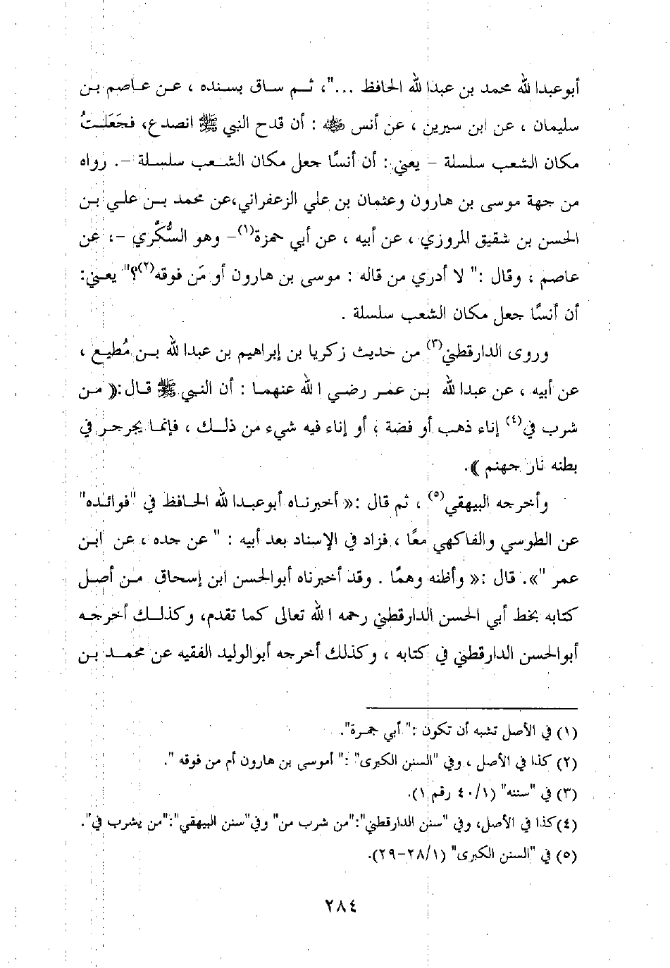أبو عبد الله محمد بن عبد الله الحافظ ... "، ثم ساق بسنده، عن عاصم بن سليمان، عن ابن سيرين، عن أنس رضي الله عنه: أن قدح النبي صلى الله عليه وسلم انصدع، فجعلت مكان الشعب سلسلة – يعني: أن أنسا جعل مكان الشعب سلسلة –. رواه من جهة موسى بن هارون وعثمان بن علي الزعفراني، عن محمد بن علي بن الحسن بن شقيق المروزي، عن أبيه، عن أبي حمزة – وهو السكري -، عن عاصم، وقال: "لا أدري من قاله: موسى بن هارون او من فوقه؟ " يعني: أن أنسا جعل مكان الشعب سلسلة.