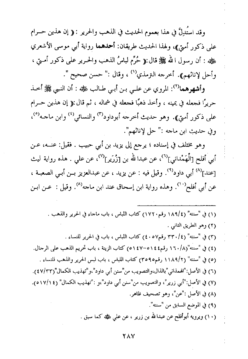 وقد استدل في هذا بعموم الحديث في الذهب والحرير: "إن هذين حرام على ذكور أمتي"، ولهذا الحديث طريقان: أحدهما رواية أبي موسى الأشعري رضي الله عنه: أن رسول الله صلى الله عليه وسلم قال: "حرم لباس الذهب والحرير على ذكور أمتي، وأحل لإناثهم". أخرجه الترمذي، وقال: "حسن صحيح".