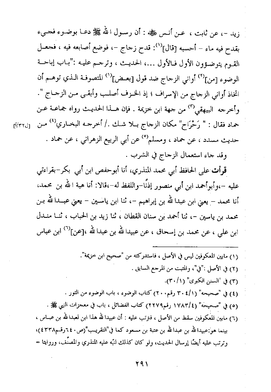 زيد –، عن ثابت، عن أنس رضي الله عنه: أن رسول الله صلى الله عليه وسلم دعا بوضوء فجيء بقدح فيه ماء – أحسبه [قال]: قدح زجاج –، فوضع أصابعه فيه، فجعل القوم يتوضؤون الأول فالأول .... ، الحديث، وترجم عليه: "باب إباحة الوضوء [من] أواني الزجاج ضد قول [بعض] المتصوفة الذي توهم أن اتخاذ أواني الزجاج من الإسراف، إذ الخزف أصلب وأبقى من الزجاج".