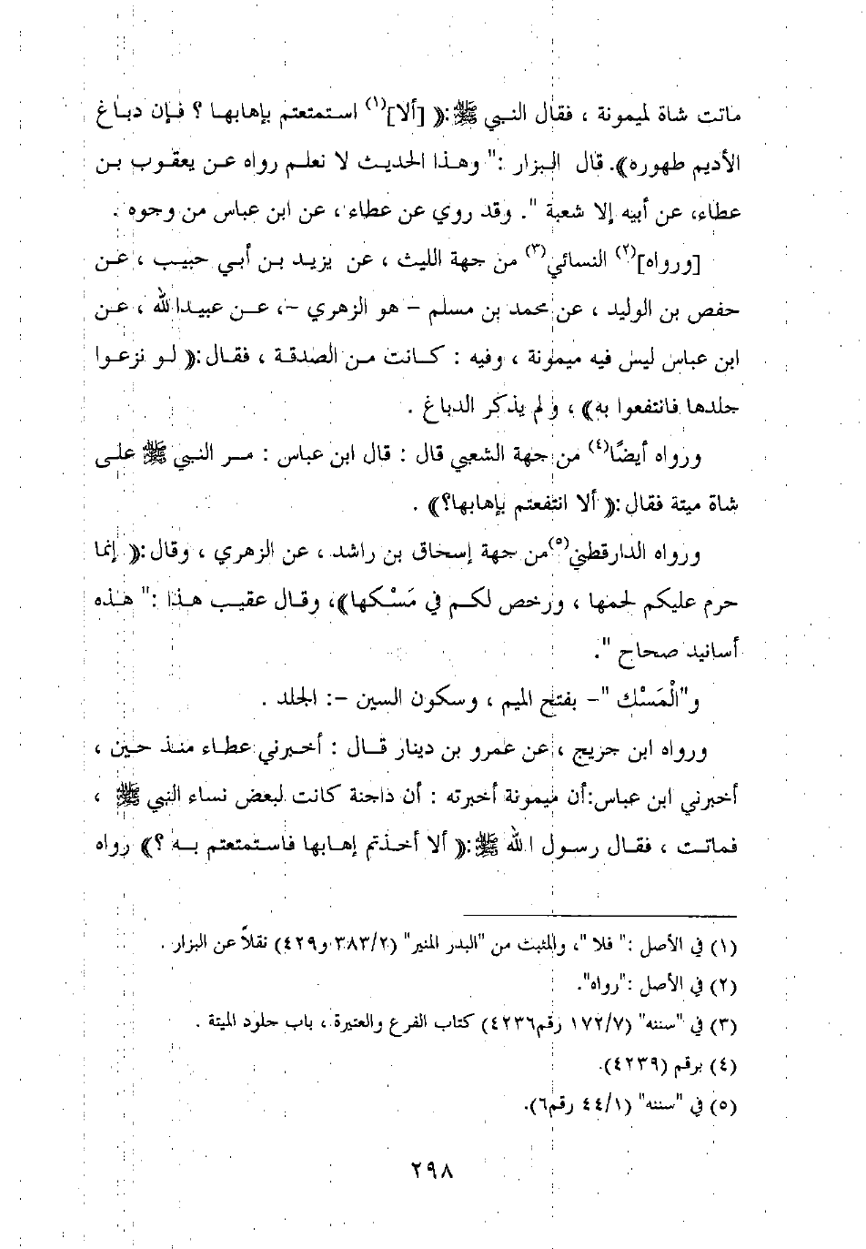 [ورواه] النسائي من جهة الليث، عن يزيد بن أبي حبيب، عن حفص بن الوليد، عن محمد بن مسلم – هو الزهري –، عن عبيد الله، عن ابن عباس ليس فيه ميمونة، وفيه: كانت من الصدقة، فقال: "لو نزعوا جلدها فانتفعوا به"، ولم يذكر الدباغ.