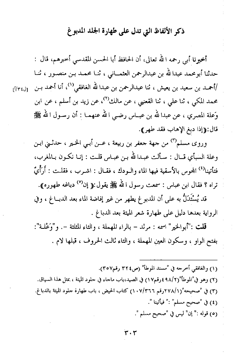 أخبرنا أبي رحمه الله تعالى، أن الحافظ أبا الحسن المقدسي أخبرهم، قال: حدثنا أبو محمد عبد الله بن عبد الرحمن العثماني، ثنا محمد بن منصور، ثنا أحمد بن سعيد بن يعيش، ثنا عبد الرحمن بن عبد الله الغافقي، أنا أحمد بن محمد المكي، ثنا علي، ثنا القعنبي، عن مالك، عن زيد بن أسلم، عن ابن وعلة المصري، عن عبد الله بن عباس رضي الله عنهما: أن رسول الله صلى الله عليه وسلم قال: "إذا دبغ الإهاب فقد طهر".