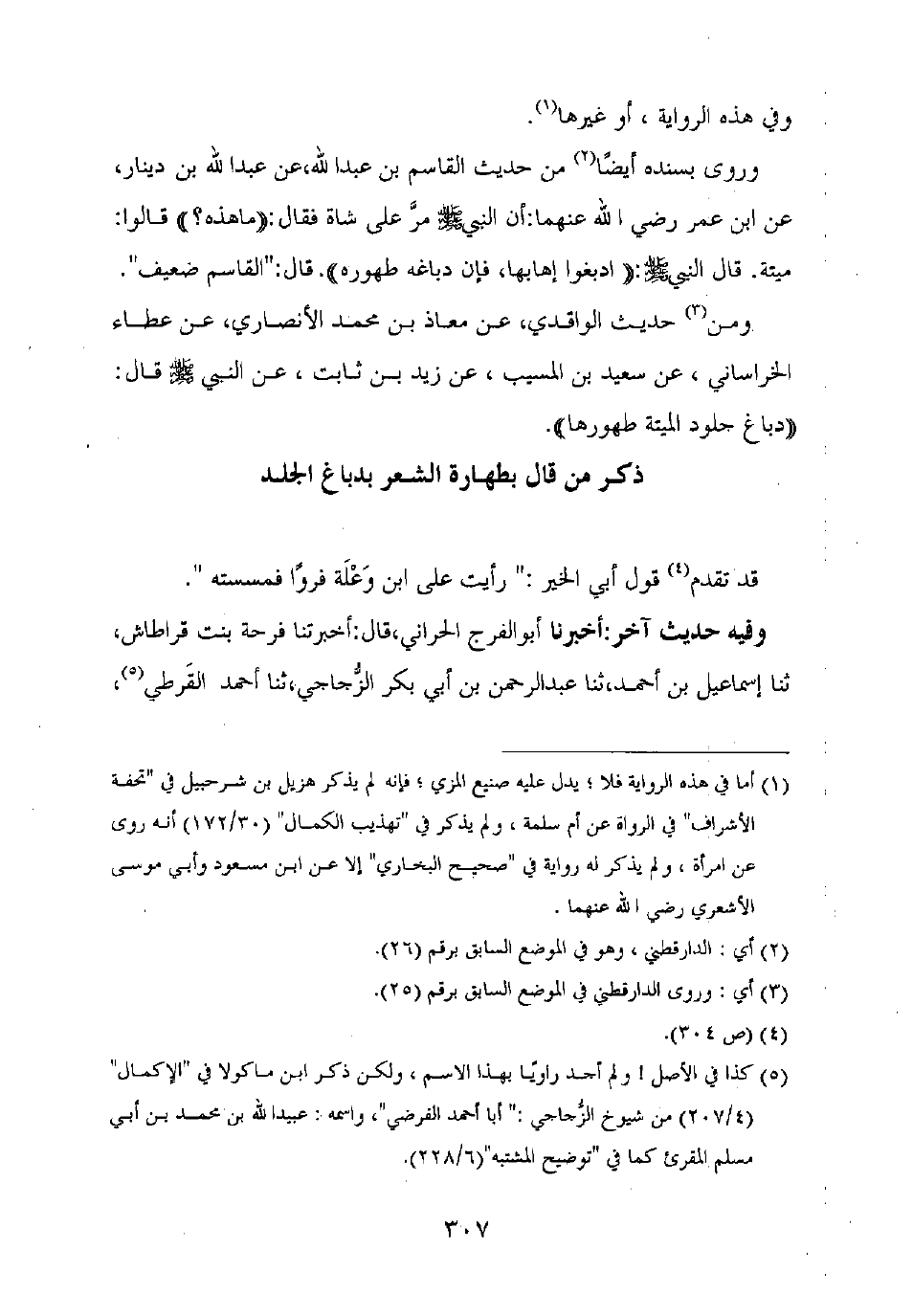 وروى بسنده أيضا من حديث القاسم بن عبد الله، عن عبد الله بن دينار، عن ابن عمر رضي الله عنهما: أن النبي صلى الله عليه وسلم مر على شاة فقال: "ما هذه؟ " قالوا: ميتة. قال النبي صلى الله عليه وسلم: "ادبغوا إهابها، فإن دباغه طهوره". قال: "القاسم ضعيف".