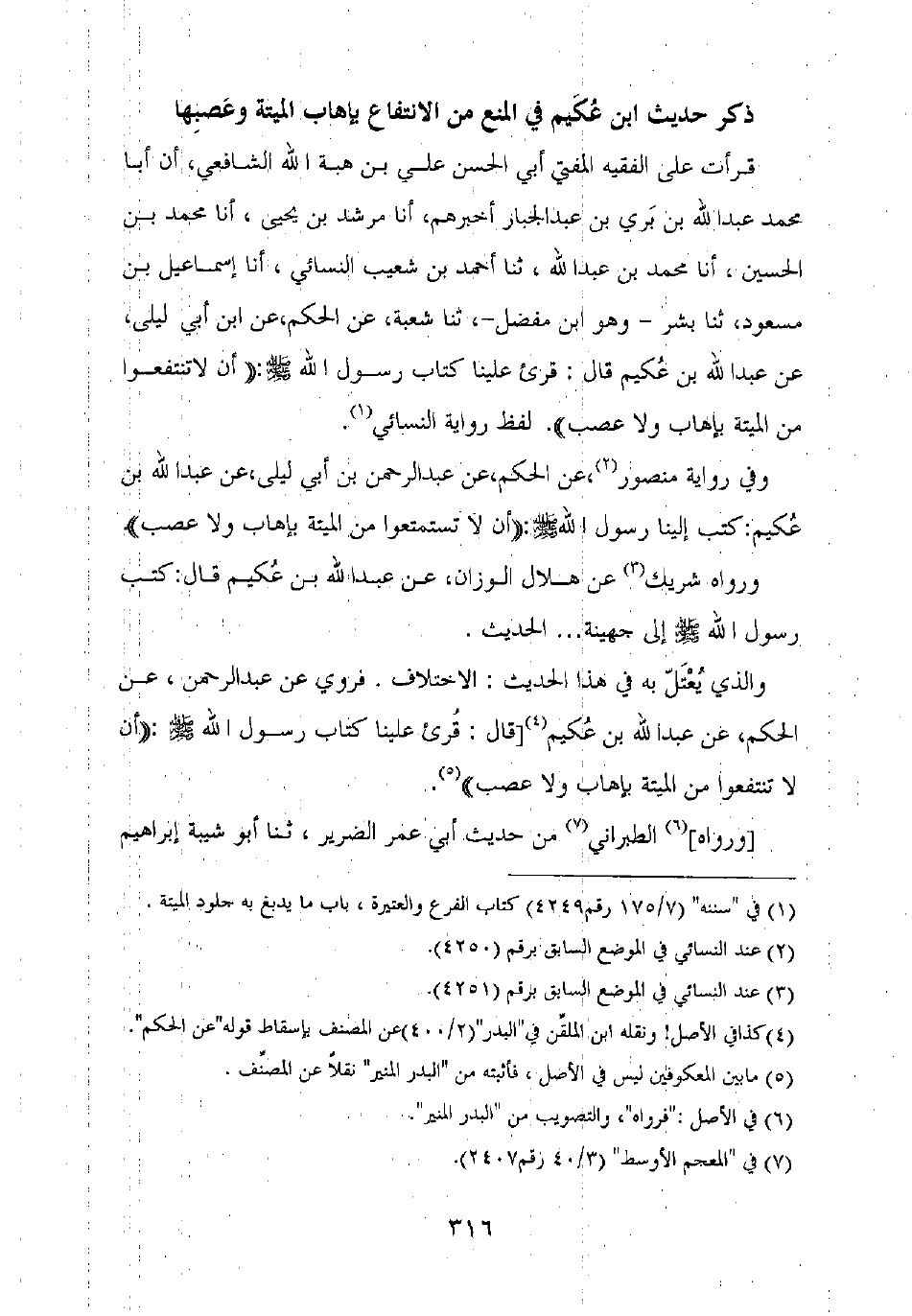 قرأت على الفقيه المفتي أبي الحسن علي بن هبة الله الشافعي، أن أبا محمد عبد الله بن بري بن عبد الجبار أخبرهم، أنا مرشد بن يحيى، أنا محمد بن الحسين، أنا محمد بن عبد الله، ثنا أحمد بن شعيب النسائي، أنا إسماعيل بن مسعود، ثنا بشر – وهو ابن مفضل –، ثنا شعبة، عن الحكم، عن ابن أبي ليلى، عن عبد الله بن عكيم قال: قرئ علينا كتاب رسول الله صلى الله عليه وسلم: "أن لاتنتفعوا من الميتة بإهاب ولا عصب". لفظ رواية النسائي.