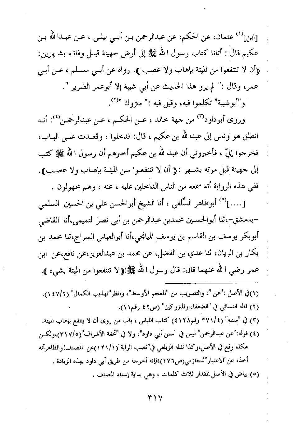 [ابن] عثمان، عن الحكم، عن عبد الرحمن بن أبي ليلى، عن عبد الله بن عكيم قال: أتانا كتاب رسول الله صلى الله عليه وسلم إلى أرض جهينة قبل وفاته بشهرين: "أن تنتفعوا من الميتة بإهاب ولا عصب". رواه عن أبي مسلم، عن أبي عمر، وقال: "لم يرو هذا الحديث عن أبي شيبة إلا أبو عمر الضرير".