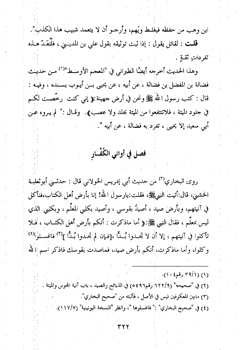 روى البخاري من حديث أبي إدريس الخولاني قال: حدثني أبو ثعلبة الخشني، قال: أتيت النبي صلى الله عليه وسلم، فقلت: يا رسول الله! إنا بأرض أهل الكتاب، فنأكل في آنيتهم، وبأرض صيد، أصيد بقوسي، وأصيد بكلبي المعلم، وبكلبي الذي ليس بمعلم، فقال النبي صلى الله عليه وسلم: "أما ما ذكرت: أنكم بأرض أهل الكتاب، فلا تأكلوا في آنيتهم، إلا أن لا تجدوا بدّا، [فإن لم تجدوا بدّا] فاغسلوا وكلوا، وأما ما ذكرت، أنكم بأرض صيد، فما صدت بقوسك فاذكر اسم الله
