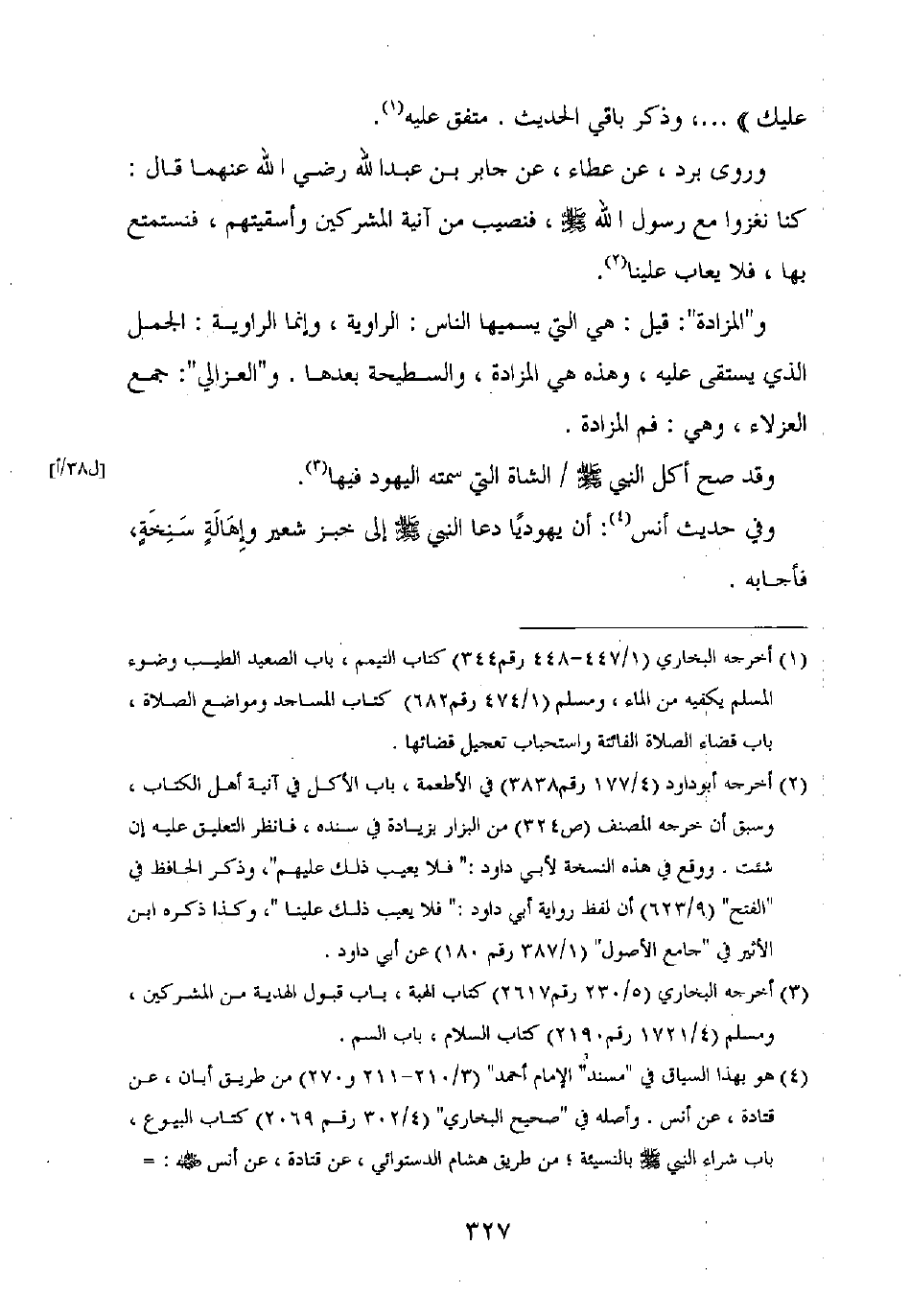 و"المزادة": قيل: هي التي يسميها الناس: الراوية، وإنما الراوية: الجمل الذي يستقى عليه، وهذه هي المزادة، والسطيحة بعدها. و"العزالي": جمع العزلاء، وهي: فم المزادة.