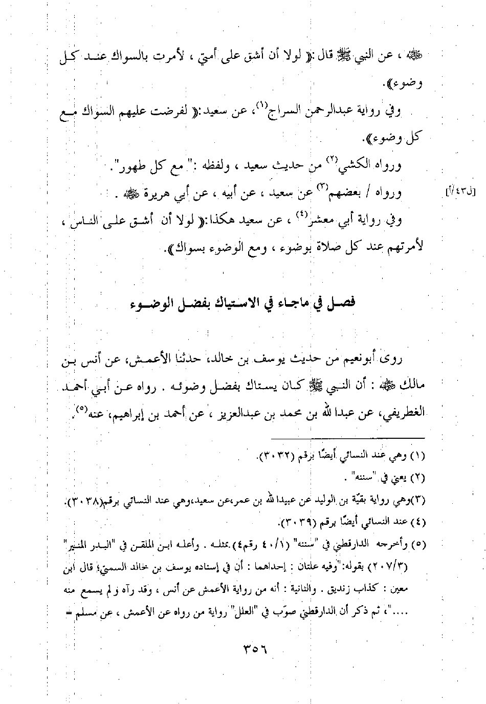 وفي رواية أبي معشر، عن سعيد هكذا: "لولا أن أشق على الناس، لأمرتهم عند كل صلاة بوضوء، ومع الوضوء بسواك".