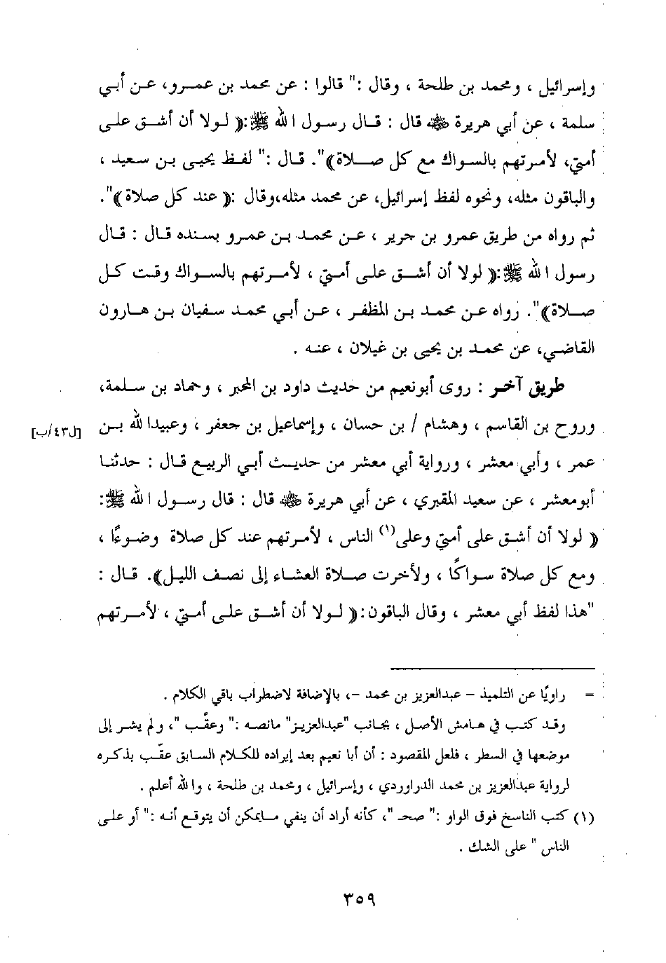 طريق آخر: روى أبو نعيم من حديث داود بن المحبر، وحماد بن سلمة، وروح بن القاسم، وهشام بن حسان، وإسماعيل بن جعفر، وعبيد الله بن عمر، وأبي معشر، ورواية أبي معشر من حديث أبي الربيع قال: حدثنا أبو معشر، عن سعيد المقبري، عن أبي هريرة رضي الله عنه قال: قال رسول الله صلى الله عليه وسلم: "لولا أن أشق على أمتي وعلى الناس، لأمرتهم عند كل صلاة وضوءا، ومع كل صلاة سواكا، ولأخرت صلاة العشاء إلى نصف الليل".