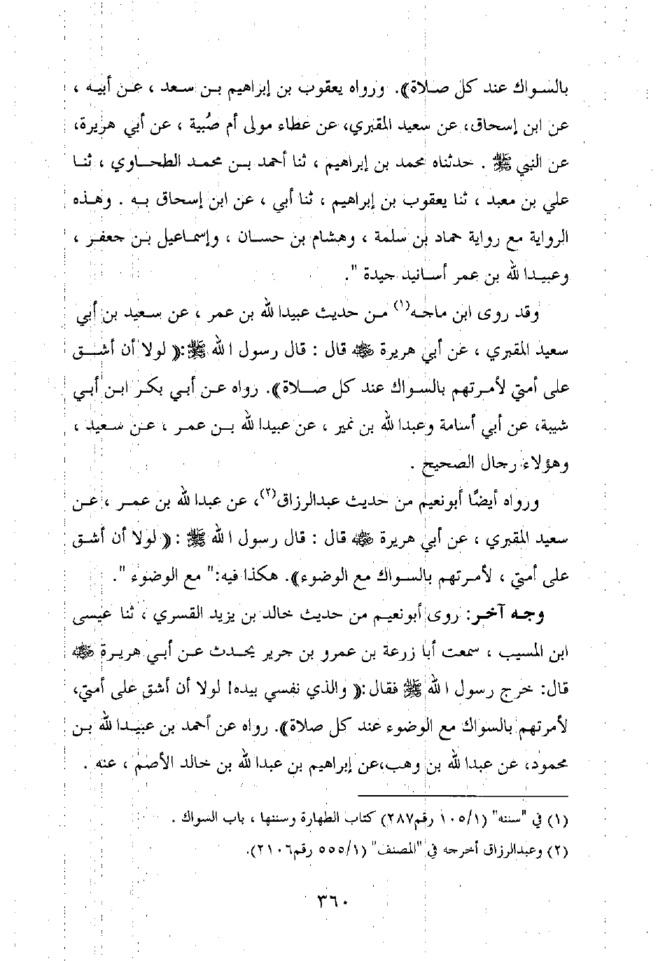 وقد روى ابن ماجه من حديث عبيد الله بن عمر، عن سعيد بن أبي سعيد المقبري، عن أبي هريرة رضي الله عنه قال: قال رسول الله صلى الله عليه وسلم: "لولا أن أشق على أمتي لأمرتهم بالسواك عند كل صلاة". رواه عن أبي بكر بن أبي شيبة، عن أبي أسامة وعبد الله بن نمير، عن عبيد الله بن عمر، عن سعيد، وهؤلاء رجال الصحيح.