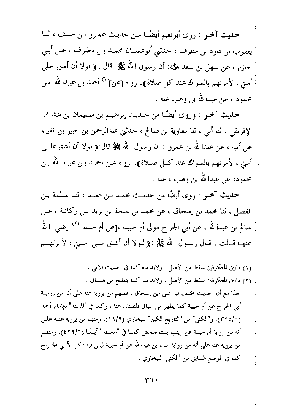 حديث آخر: وروى أيضا من حديث محمد بن حميد، ثنا سلمة بن الفضل، ثنا محمد بن إسحاق، عن محمد بن طلحة بن يزيد بن ركانة، عن سالم بن عبد الله، عن أبي الجراح مولى أم حبيبة، [عن أم حبيبة] رضي الله عنها قالت: قال رسول الله صلى الله عليه وسلم: "لولا أن أشق على أمتي، لأمرتهم بالسواك عند كل صلاة".