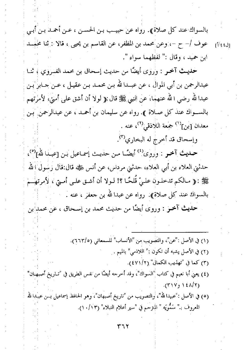 حديث آخر: وروى أيضا من حديث إسماعيل بن [عبد الله]، حدثني العلاء بن أبي العلاء، حدثني مرداس، عن أنس رضي الله عنه قال: قال رسول الله صلى الله عليه وسلم: "ما لكم تدخلون علي قلحا؟! لولا أن أشق على أمتي، لأمرتهم بالسواك عند كل صلاة". رواه عن عبد الله بن جعفر، عنه.