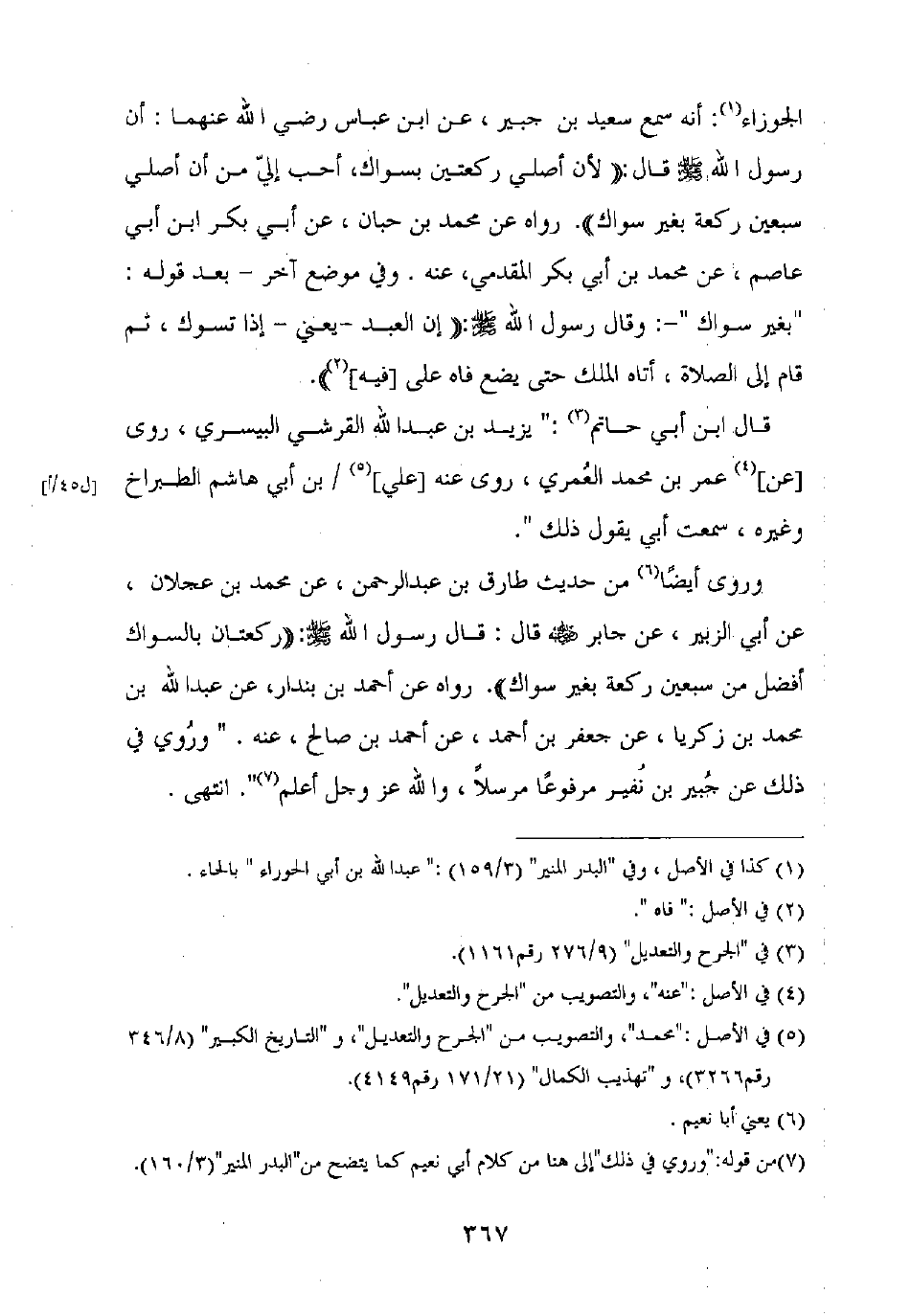 الجوزاء: أنه سمع سعيد بن جبير، عن ابن عباس رضي الله عنهما: أن رسول الله صلى الله عليه وسلم قال: "لأن أصلي ركعتين بسواك أحب إلي من أن أصلي سبعين ركعة بغير سواك". رواه عن محمد بن حبان، عن أبي بكر بن أبي عاصم، عن محمد بن أبي بكر المقدمي، عنه. وفي موضع آخر – بعد قوله: "بغير سواك" –: وقال رسول الله صلى الله عليه وسلم: "إن العبد – يعني – إذا تسوك، ثم قام إلى الصلاة، أتاه الملك حتى يضع فاه على [فيه] ".
