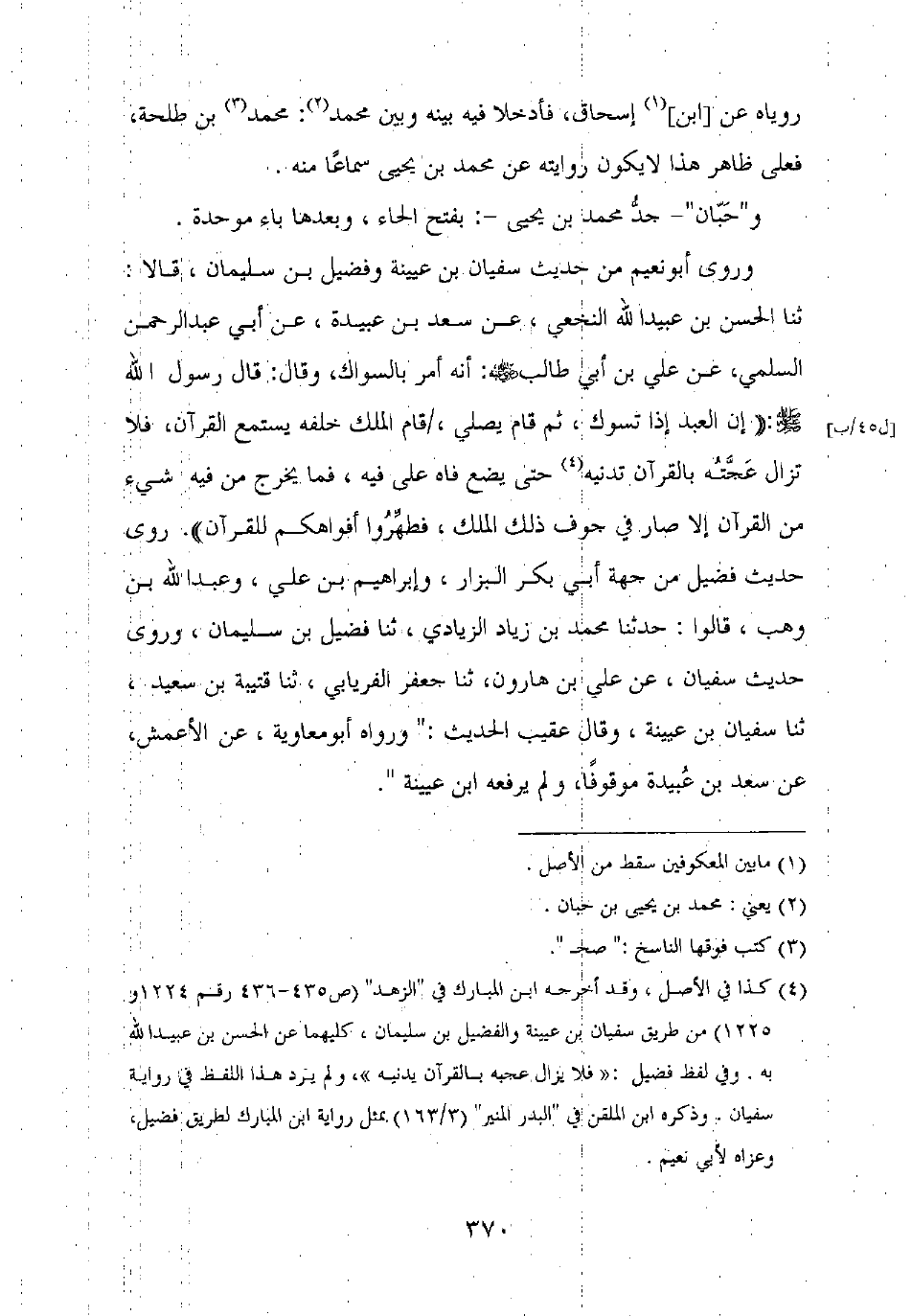وروى أبو نعيم من حديث سفيان بن عيينة وفضيل بن سليمان، قالا: ثنا الحسن بن عبيد الله النخعي، عن سعد بن عبيدة، عن أبي عبد الرحمن السلمي، عن علي بن أبي طالب رضي الله عنه: أنه أمر بالسواك، وقال: قال رسول الله صلى الله عليه وسلم: "إن العبد إذا تسوك، ثم قام يصلي، قام الملك خلفه يستمع القرآن، فلا تزال عجته بالقرآن تدنيه حتى يضع فاه على فيه، فما يخرج من فيه شيء من القرآن إلا صار في جوف ذلك الملك، فطهروا أفواهكم للقرآن". روى حديث فضيل من جهة أبي بكر البزار، وإبراهيم بن علي، وعبد الله بن وهب، قالوا: حدثنا محمد بن زياد الزيادي، ثنا فضيل بن سليمان، وروى حديث سفيان، عن علي بن هارون، ثنا جعفر الفريابي، ثنا قتيبة بن سعيد، ثنا سفيان بن عيينة، وقال عقيب الحديث: "ورواه أبو معاوية، عن الأعمش، عن سعد بن عبيدة موقوفا، ولم يرفعه ابن عيينة".