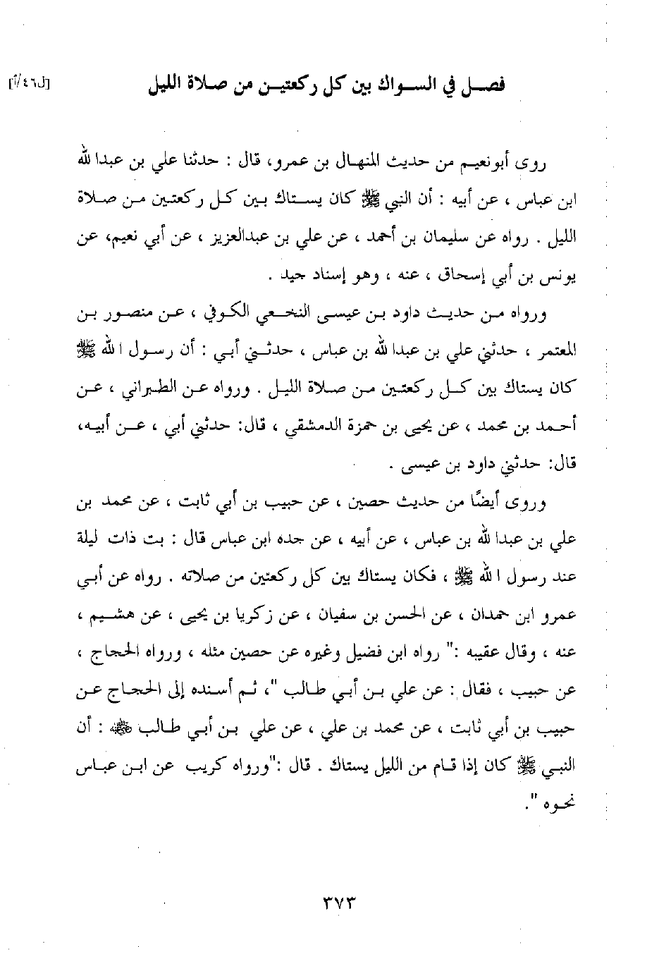 روى أبو نعيم من حديث المنهال بن عمرو قال: حدثنا علي بن عبد الله بن عباس، عن أبيه: أن النبي صلى الله عليه وسلم كان يستاك بين كل ركعتين من صلاة الليل. رواه عن سليمان بن أحمد، عن علي بن عبد العزيز، عن أبي نعيم، عن يونس بن أبي إسحاق، عنه، وهو إسناد جيد.