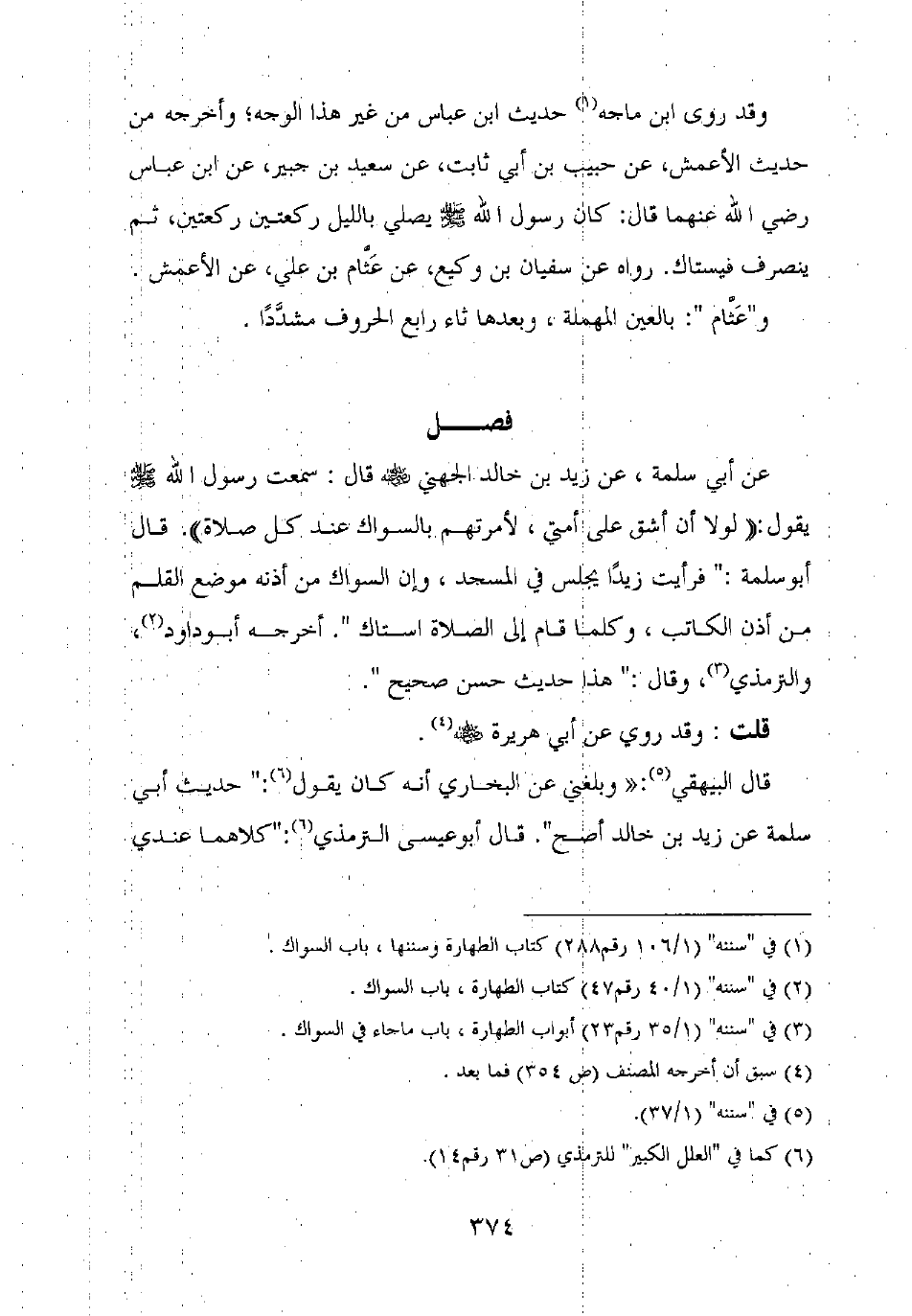 وقد روى ابن ماجه حديث ابن عباس من غير هذا الوجه، وأخرجه من حديث الأعمش، عن حبيب بن أبي ثابت، عن سعيد بن جبير، عن ابن عباس رضي الله عنهما قال: كان رسول الله صلى الله عليه وسلم يصلي بالليل ركعتين ركعتين، ثم ينصرف فيستاك. رواه عن سفيان بن وكيع، عن عثام بن علي، عن الأعمش.
